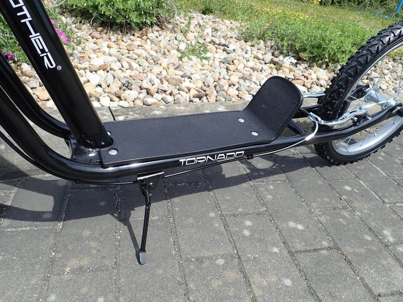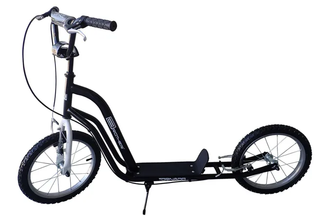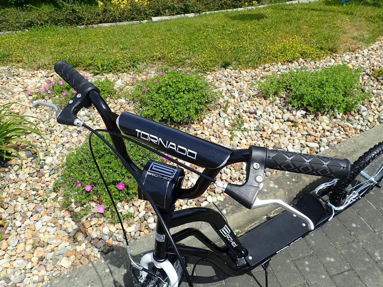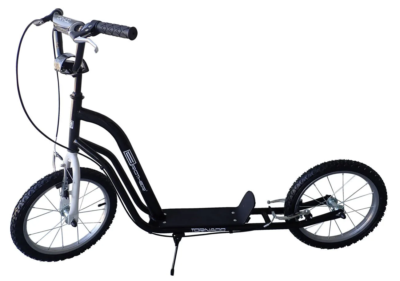 Koloběžka pro děti i dospělé ACRA Brother Tornado 16/16" černá CSK25. Doporučené od 9 let, nosnost 90 kg. Rám Hi-tech vyztužená ocel. Pneumatiky 16" + 16" nafukovací, ráfky - ocelové zušlechtěné, max. doporučený tlak v pneumatikách 2,5 Bar.