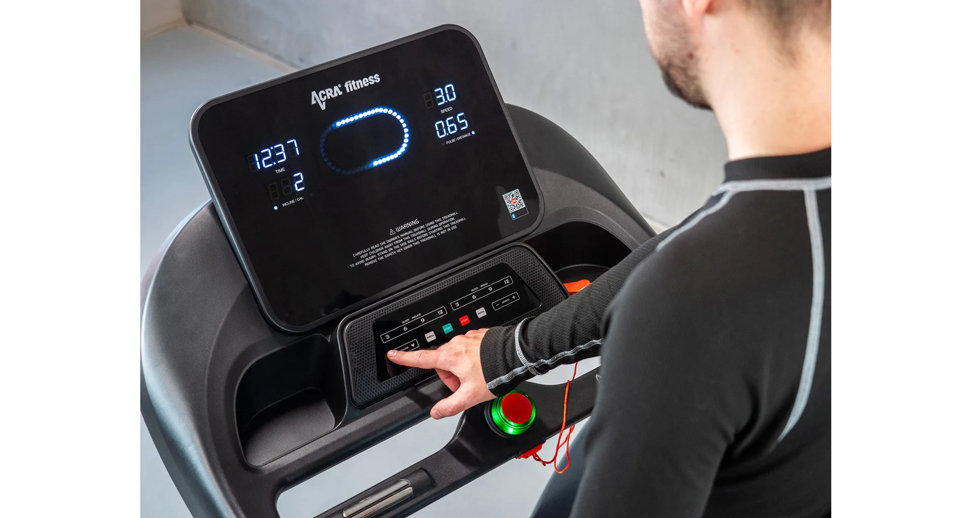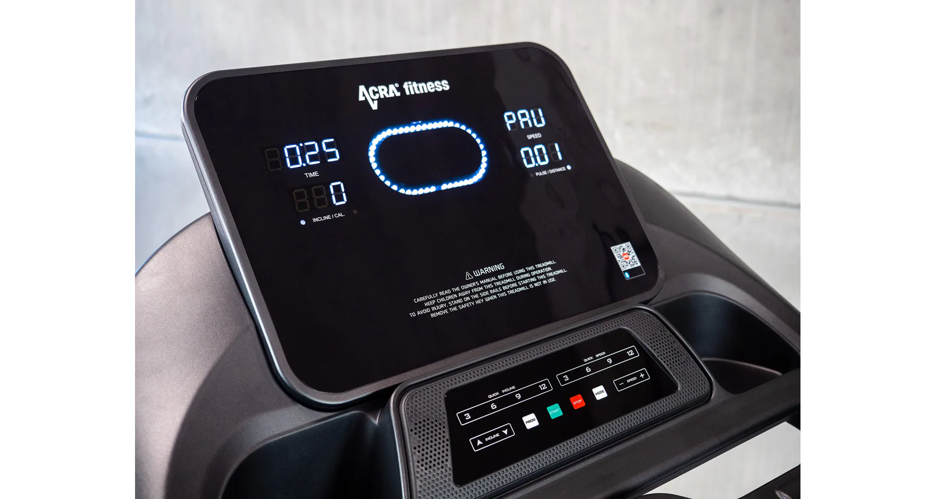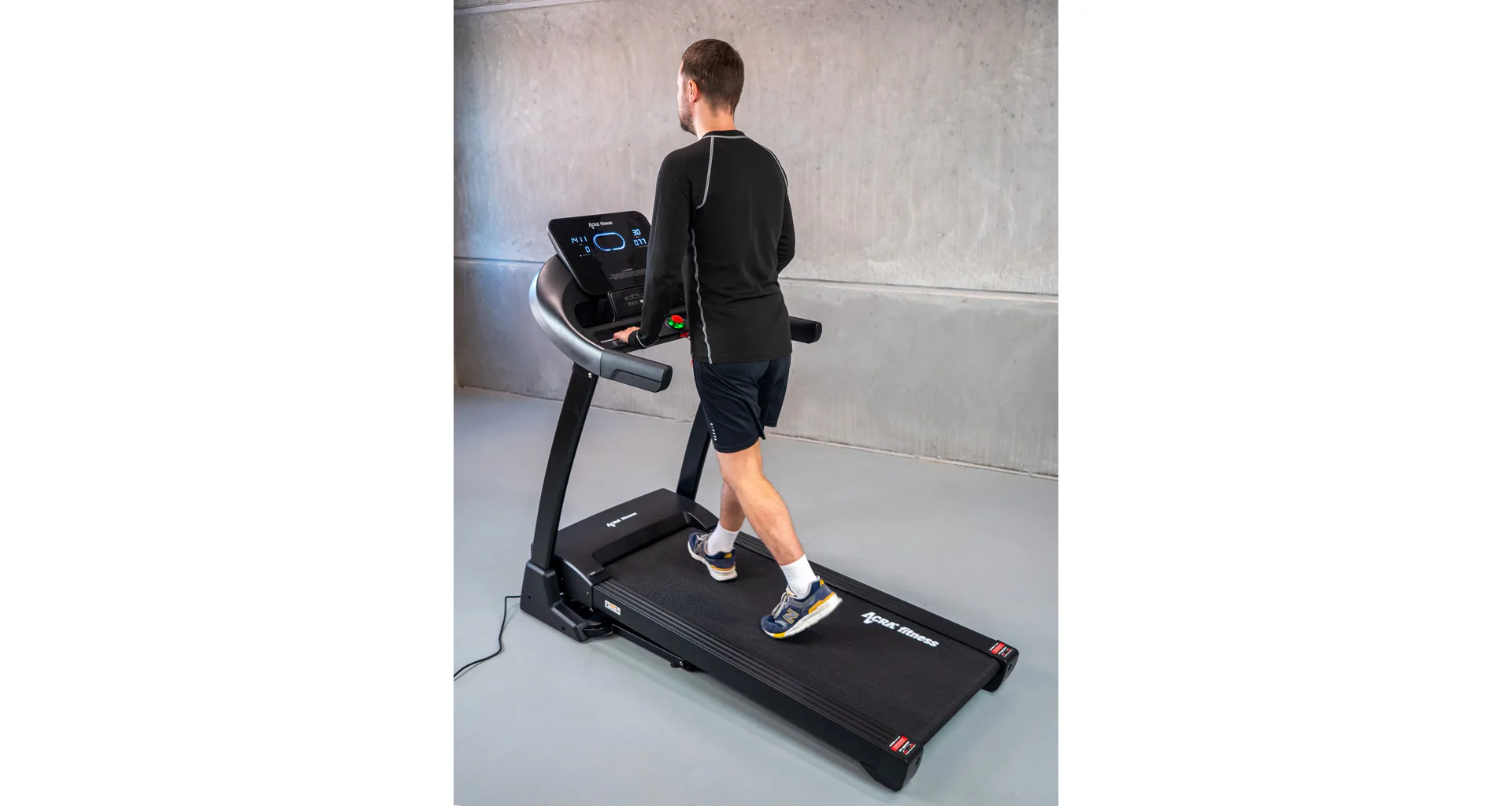 LCD displej zobrazuje důležité informace jako čas, spálené kalorie, rychlost, vzdálenost, tepovou frekvenci, úhel náklonu, tělesný tuk a další, které jsou uvedeny v návodu. Zároveň je možné pás připojit k oblíbené běžecké aplikaci FitShow Run Ride Row Indoor (aplikace je ke stažení na Google Play a App Store).