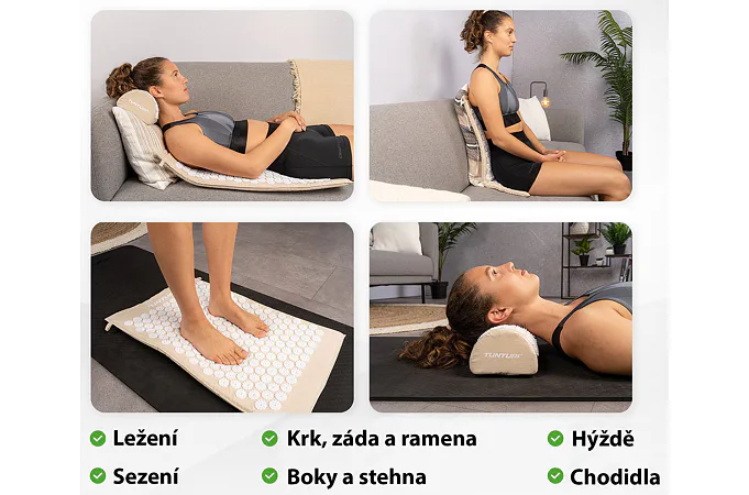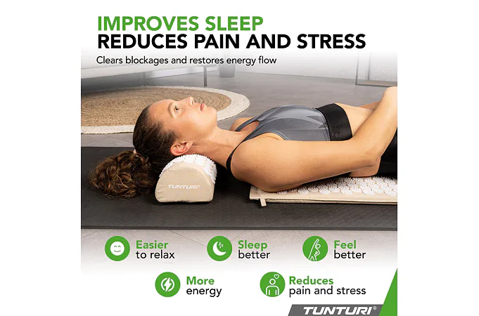Výhody akupresurní podložky Tunturi s polštářem:• Snižuje bolest a stres• Zlepšuje váš krevní oběh, kvalitu spánku a hladinu energie• Výsledky za pouhých 10 minut denně• Snímatelné, pratelné potahy vyrobené z bavlny šetrné k pokožce• Kompletní sada s podložkou, polštářem a pouzdrem