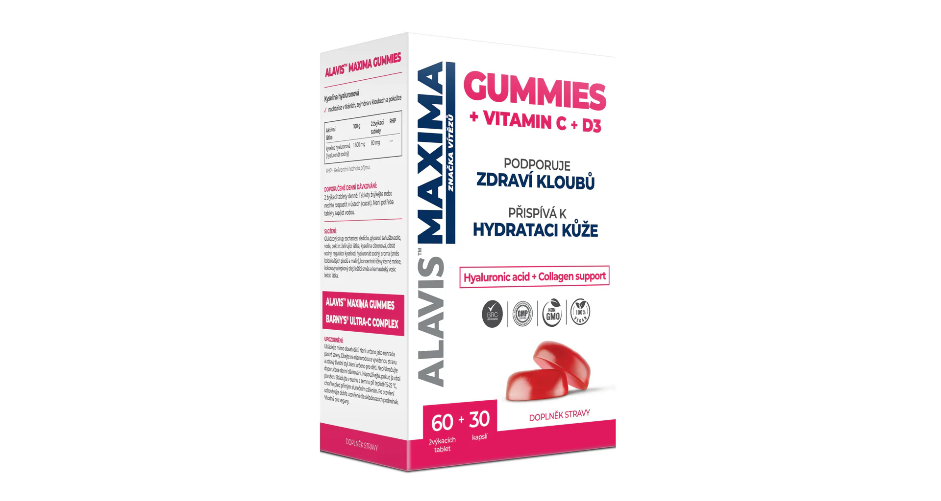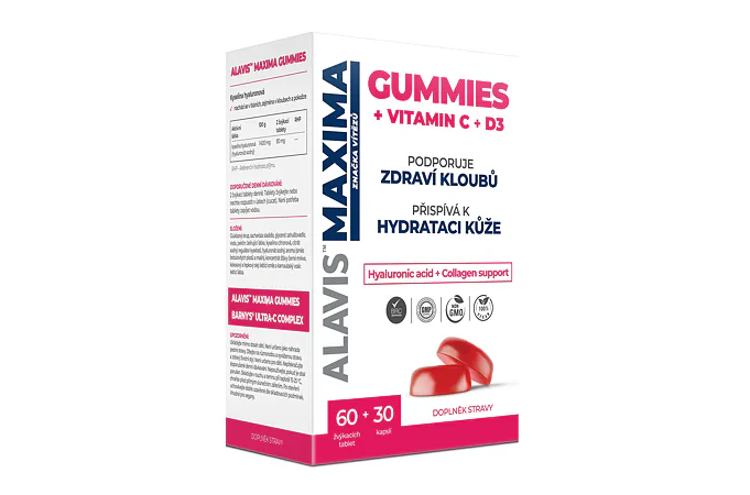 ALAVIS MAXIMA Gummies 60 tablet + 30 kapslí obsahuje 60 žvýkacích tablet ALAVIS MAXIMA Gummies a 30 kapslí BARNYS® ULTRA-C COMPLEX.