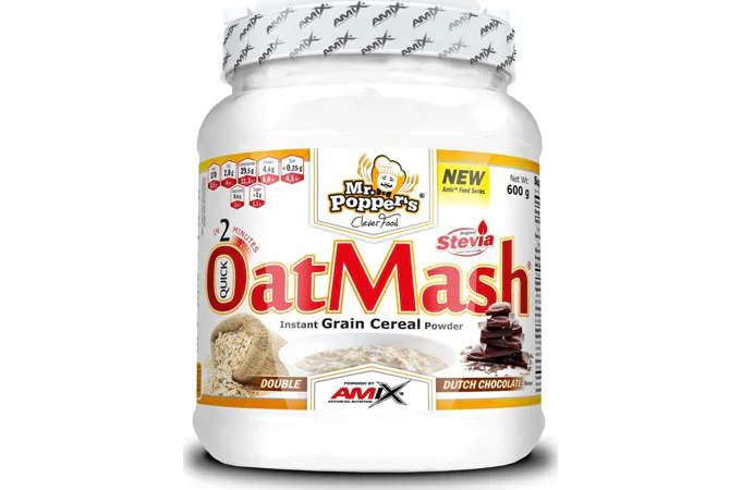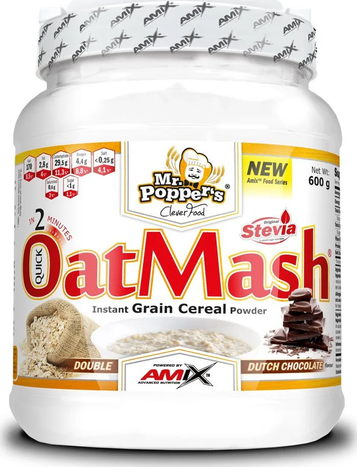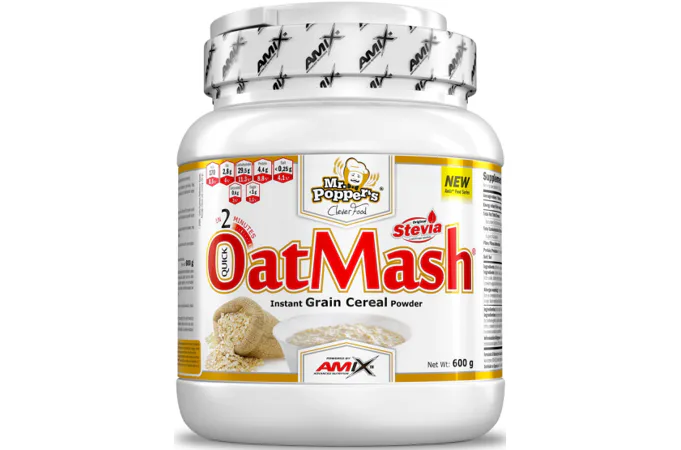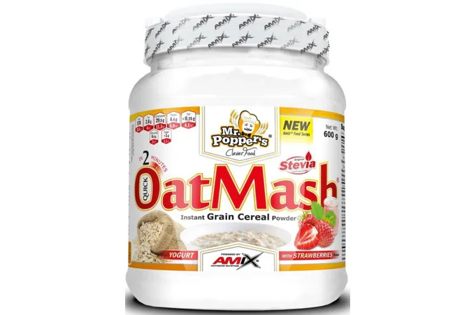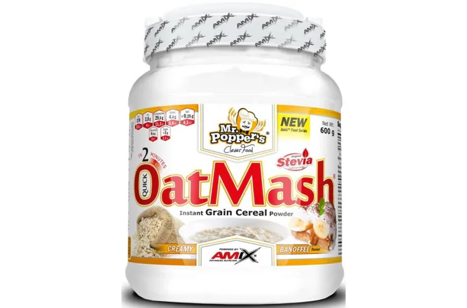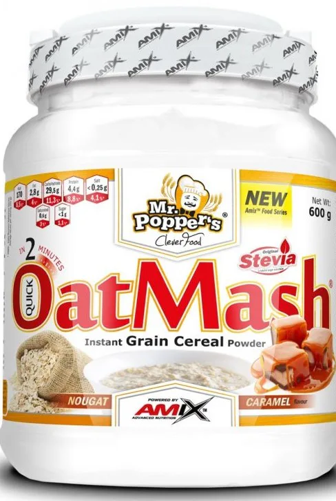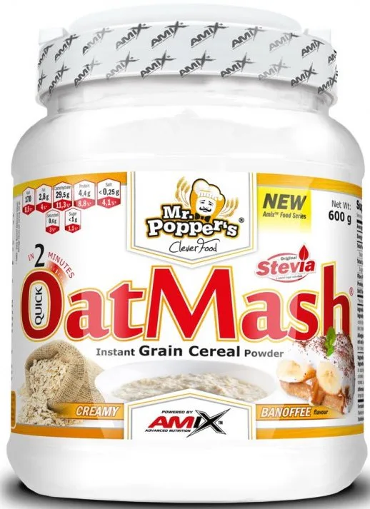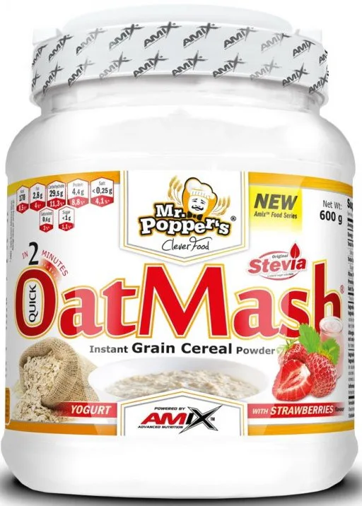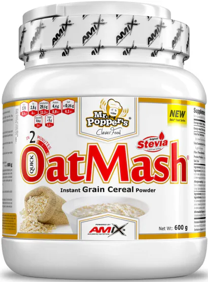 Ovesná kaše: – smíchejte 1 odměrku OatMash® (50 g) s 200 ml horké vody nebo mléka. Vše dobře promíchejte polévkovou lžící. Počkejte 2 minuty. Kaši si můžete ochutit medem a ozdobit ovocem nebo oříšky. Hustotu kaše můžete měnit dle své potřeby.