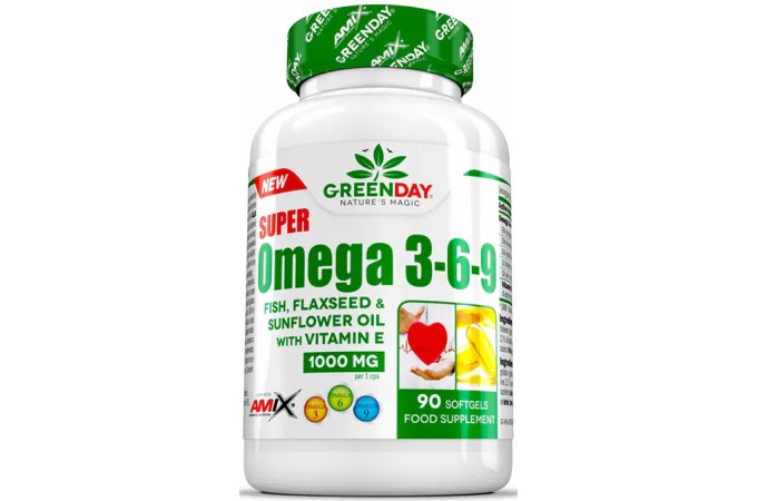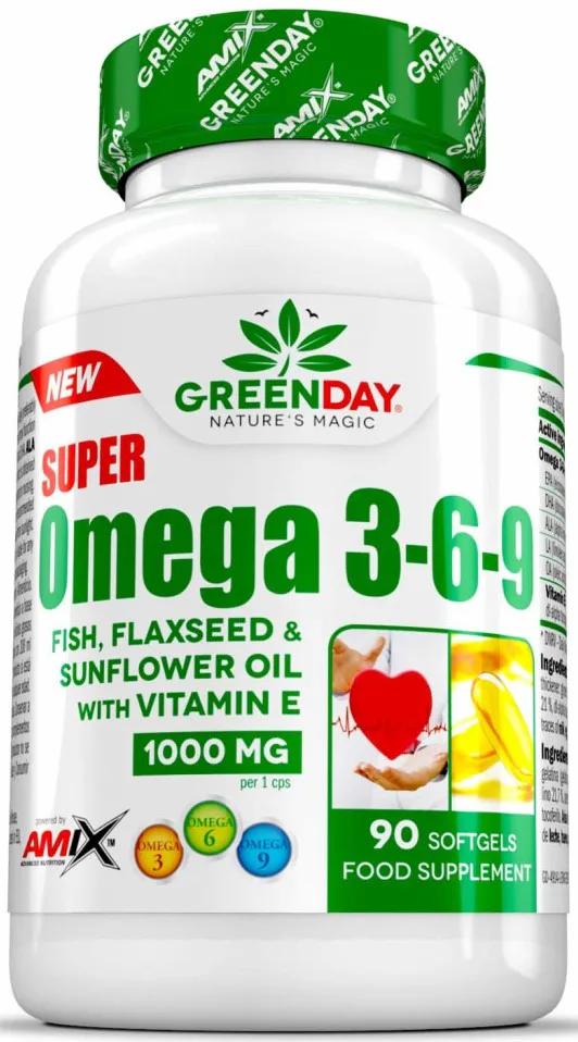 GreenDay® Super Omega 3-6-9 obsahuje extrakt z rybího, slunečnicového a lněného oleje v měkké želatinové kapsli, které jsou zdrojem nenasycených mastných kyselin.