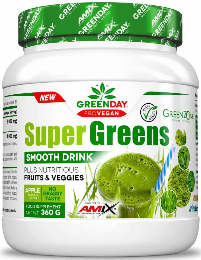 GreenDay® Super Greens Smooth Drink je doplněk stravy pro přípravu chutného zeleného nápoje plného energie a antioxidantů. Obsahuje Greens Komplex, VitaVeggie® and VitaBerry® pro kontrolu tělesné hmotnosti a zdravé trávení.
