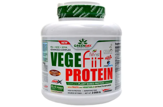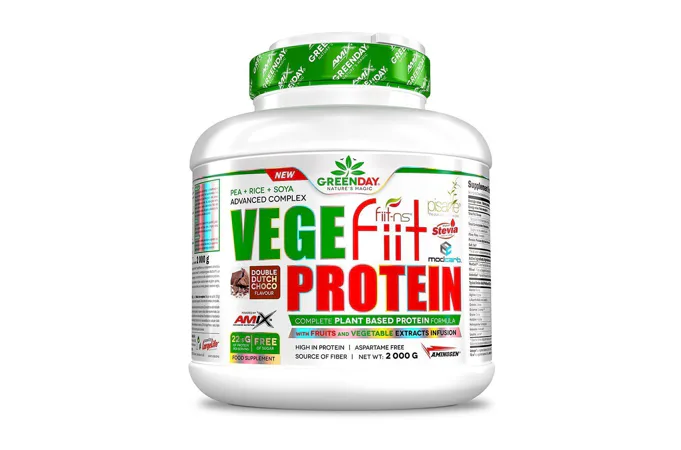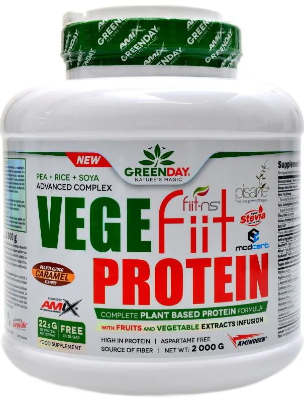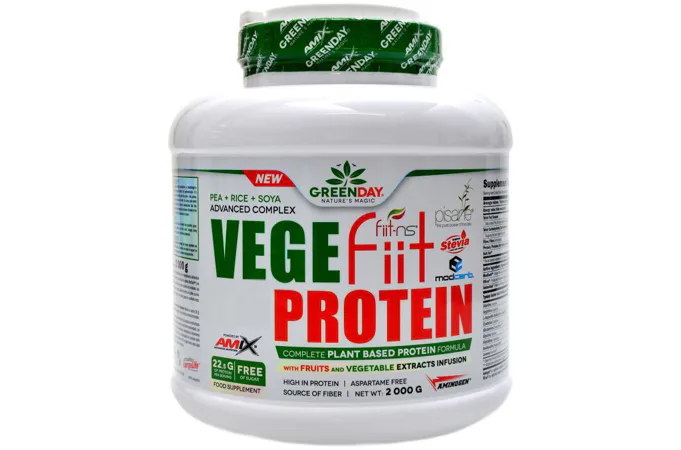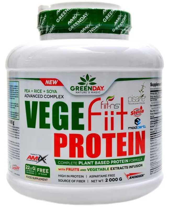 GreenDay® Vegefiit Protein je perfektní řešení pro každého, kdo hledá bílkovinný produkt rostlinného původu. Skládá se z hrachového bílkovinného izolátu Pisane®, rýžového proteinu a sojového proteinu obohacené o proteázové enzymy AminoGen®, vícezrnný matrix ModCarb™ a ovocno-zeleninový komplex Fiit-ns®.