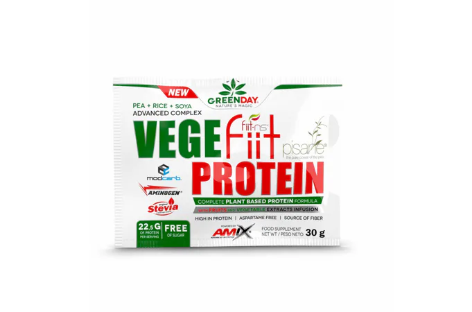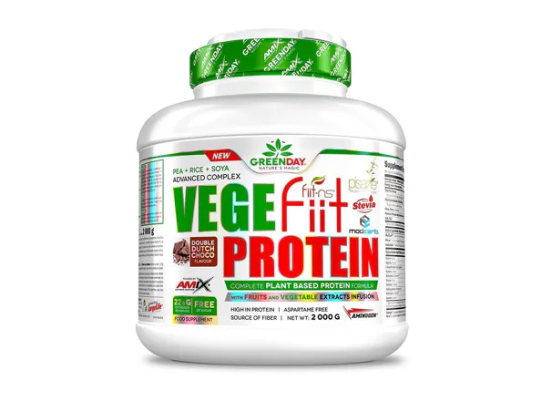 GreenDay® Vegefiit Protein je perfektní řešení pro každého, kdo hledá bílkovinný produkt rostlinného původu. Skládá se z hrachového bílkovinného izolátu Pisane®, rýžového proteinu a sojového proteinu obohacené o proteázové enzymy AminoGen®, vícezrnný matrix ModCarb™ a ovocno-zeleninový komplex Fiit-ns®.