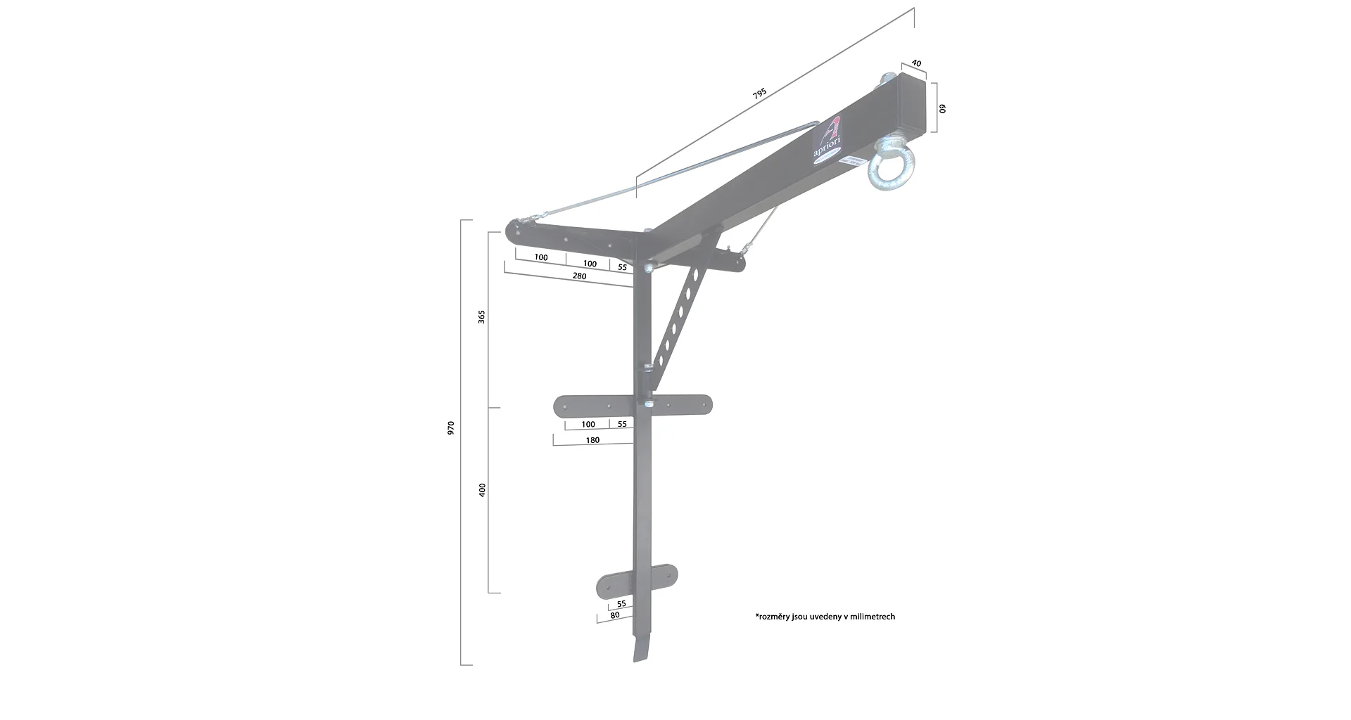 Držák na boxovací pytel - šibenice PROFI - otočný na rovnou stěnu. Držák tvoří šibenici, která snese zatížení jak úderech, tak při kopech. Šibenice je ve složeném stavu, po sestavení je rameno ve fixním poloze, ale dá se otočit směrem do strany.