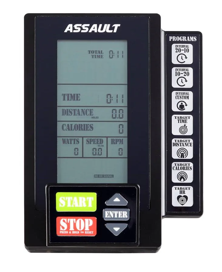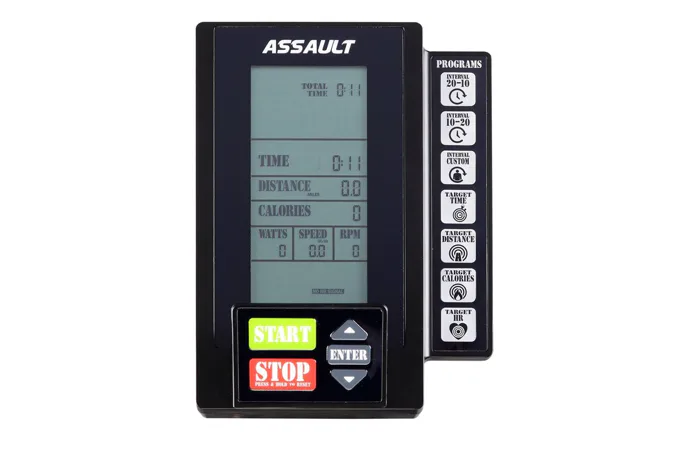 Samotný ASSAULT AIR BIKE disponuje LCD displejem, který nabízí několik tréninkových režimů. Zobrazuje hodnoty času, vzdálenosti, RPM, spálené kalorie, výkonu a tepové frekvence. Tepová frekvence je snímatelná hrudním pásem.