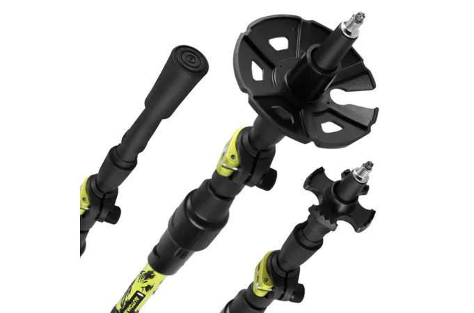 Ergonomická rukojeť s pěnou EVA a strukturálním plastem výborně padne do ruky, snižuje únavu a dobře funguje i za nepříznivého počasí. Díky profilovanému tvaru poskytuje výbornou kontrolu a jistý úchop v jakémkoli prostředí. Součástí balení jsou vyměnitelné trekové talířky a přepravní vak, díky čemuž máte kompletní výbavu vždy po ruce a připravenou na jakoukoli výpravu.
