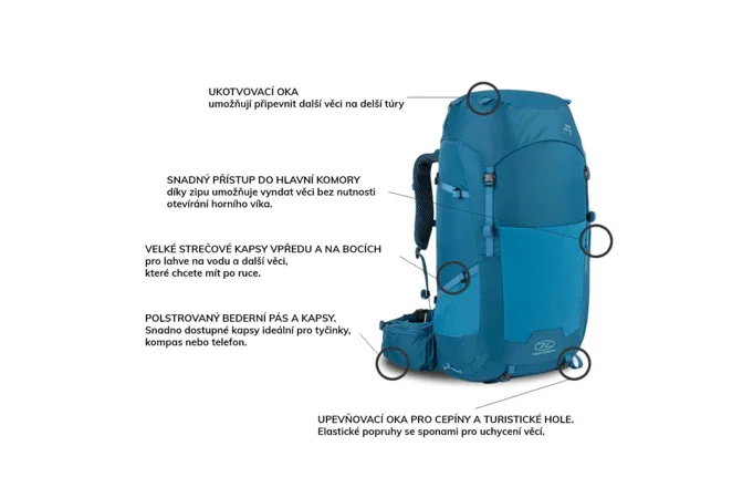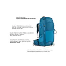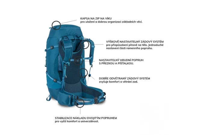 FUNKCE- Výškově nastavitelný zádový systém Airflow- Snadno přístupný zip do hlavní komory- Kapsa na zip ve víku- Snadno přístupný systém stahovacích šňůrek do hlavní komory- Oka pro uchycení cepínů/chodeckých holí- Držák na hole- Body pro uchycení víka- Stabilizace zatížení dvojitými popruhy na ramenních popruzích a bederním pásu- Nastavitelné ramenní popruhy a bederní pás- 2 kapsy na zip na bederním pásu- Nastavitelný hrudní popruh s přezkou s píšťalkou- Velké elastické přední a boční kapsy- Přezky Duraflex- Informace pro případ nouze a průvodce balením- Kompatibilní s hydratačním systémem- Chytré suché zipy na popruzích- Pláštěnka proti dešti