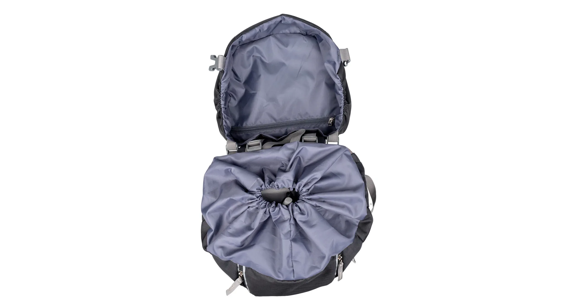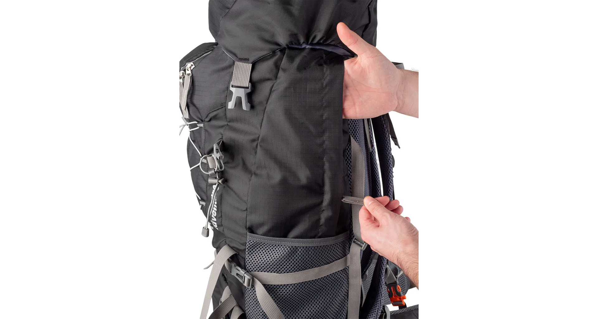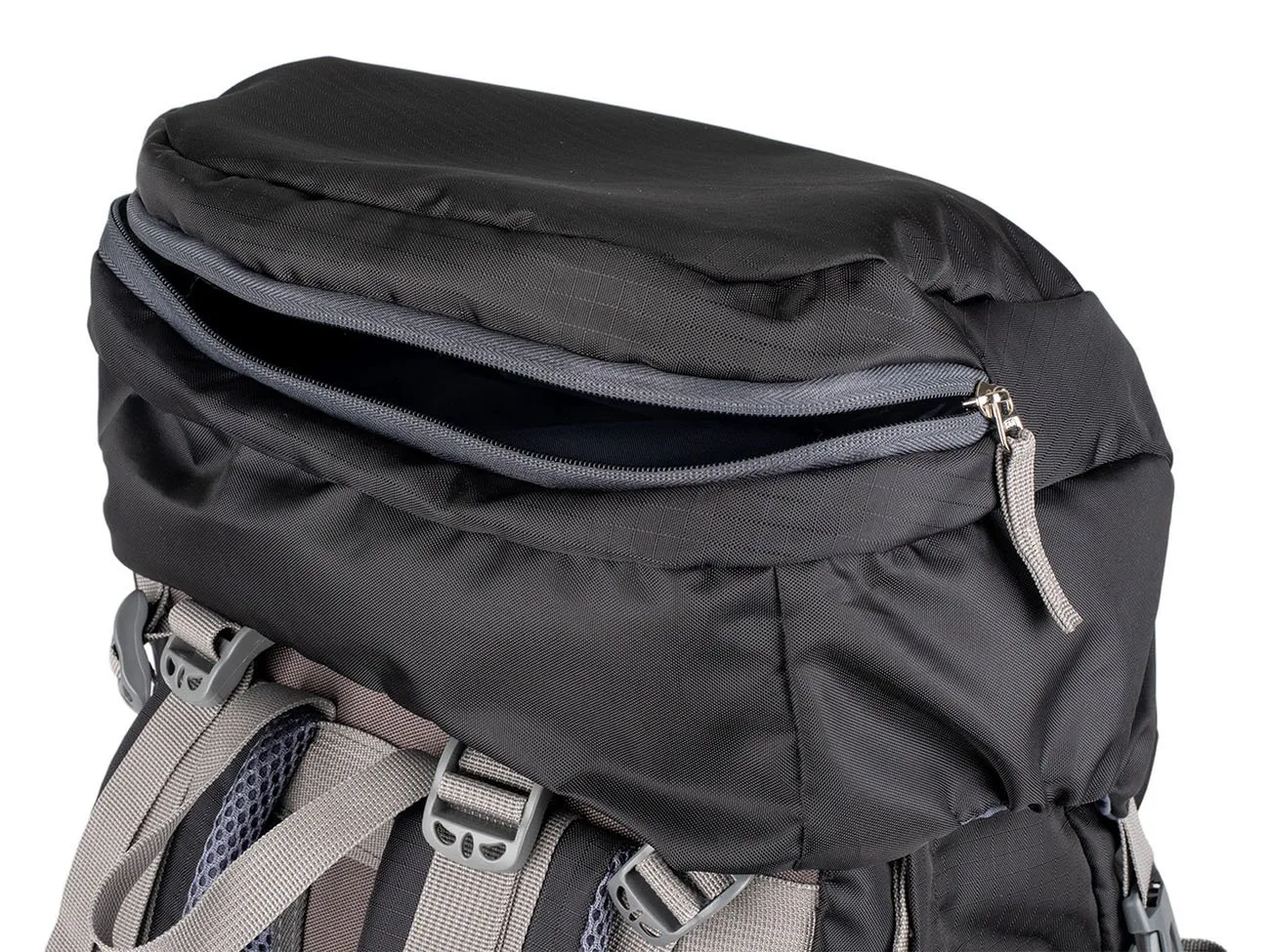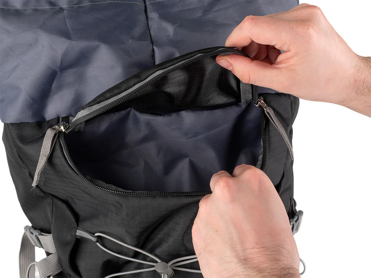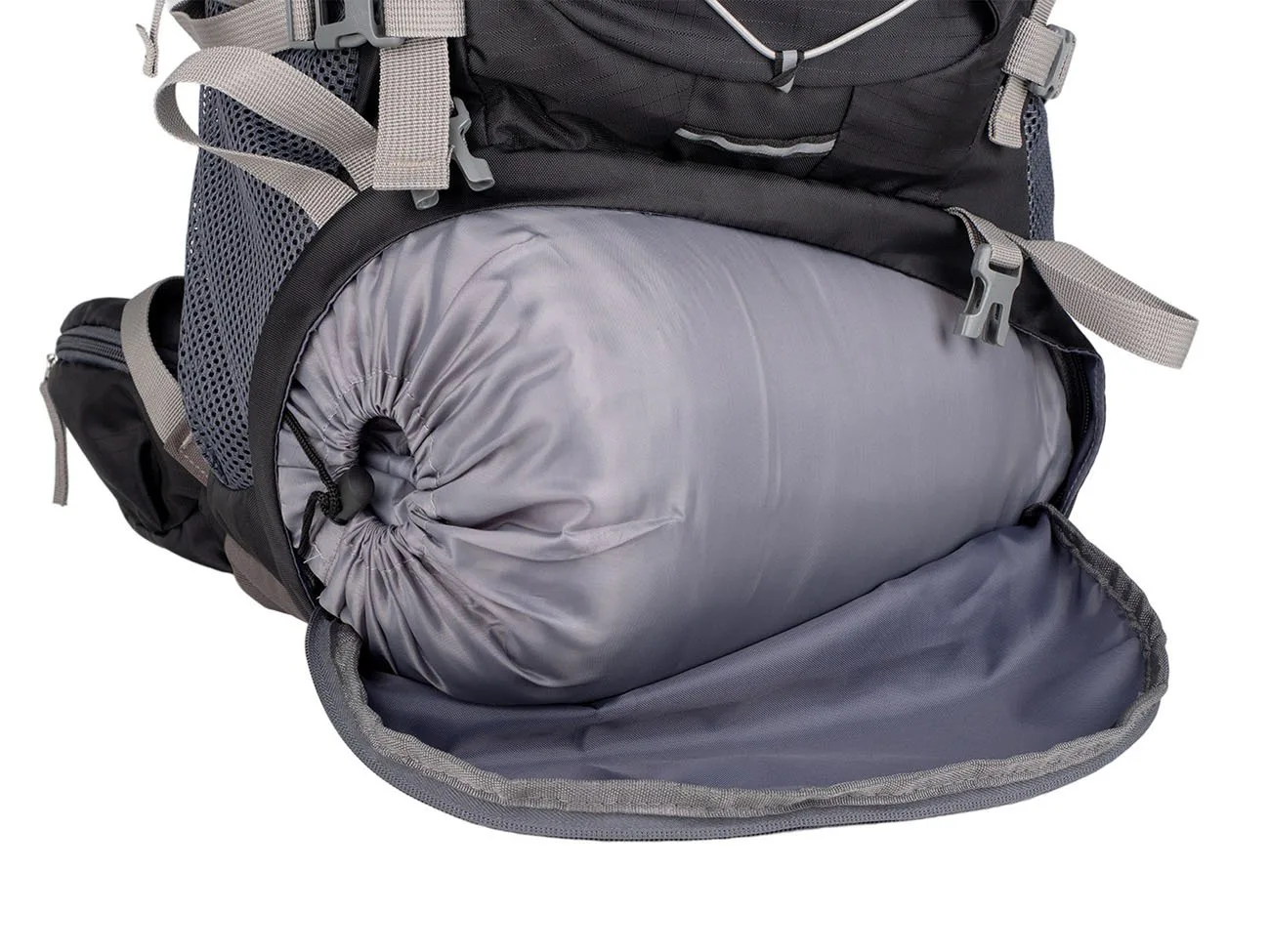 Do spodní části je přístup otevřením zipu na přední stěqně batohu. Vytvořený prostor slouží pro oddělení např. bot od ostatních použitých nebo špinavých věcí od ostatního nákladu. 2 velké síťované kapsy se stahovací pružinkou po stranách batohu a vpředu uprostřed umístěná svislá kapsa na zip umožňuje praktické rozmístění přenášených věcí.