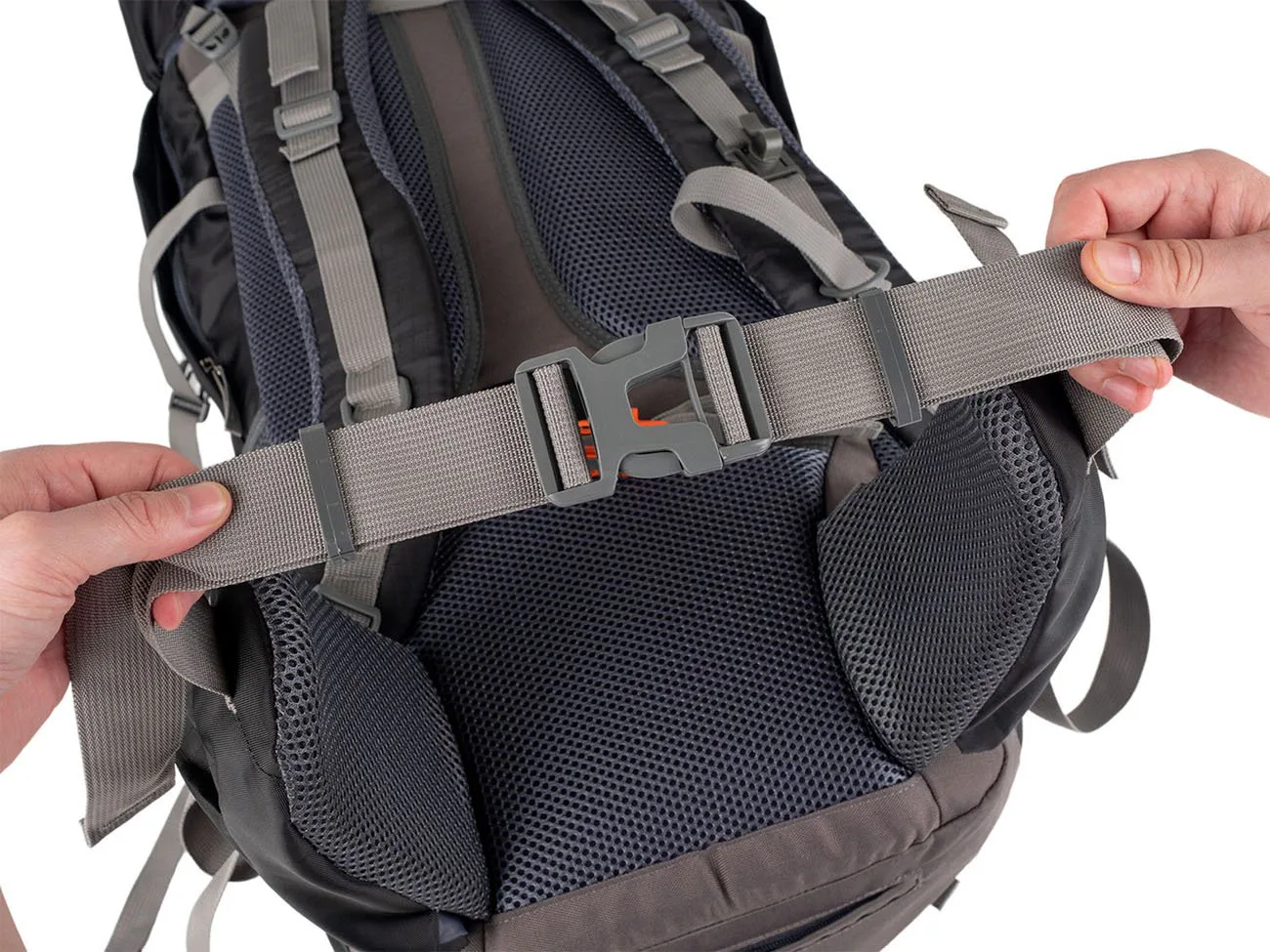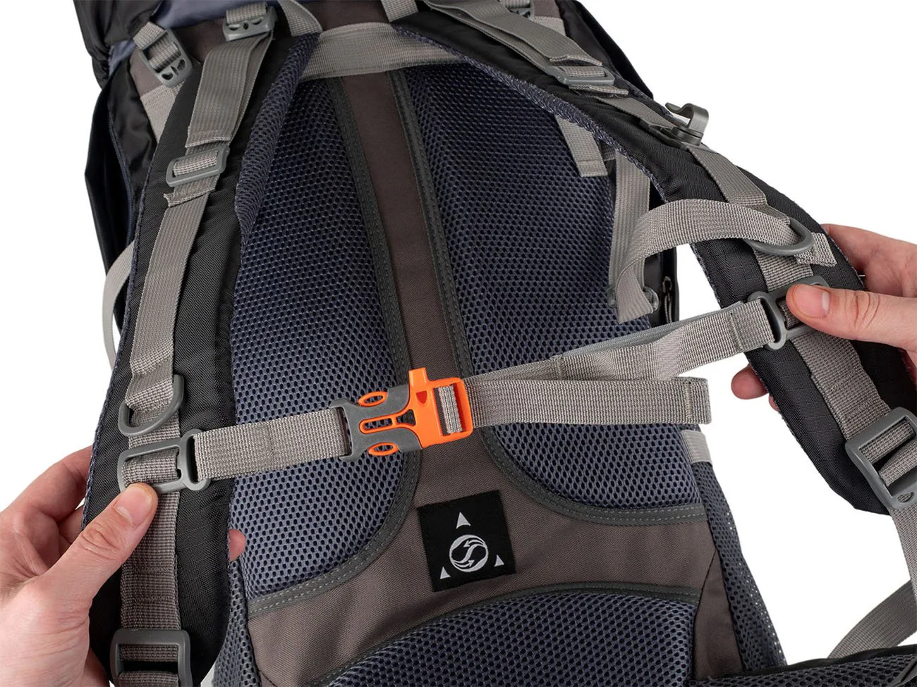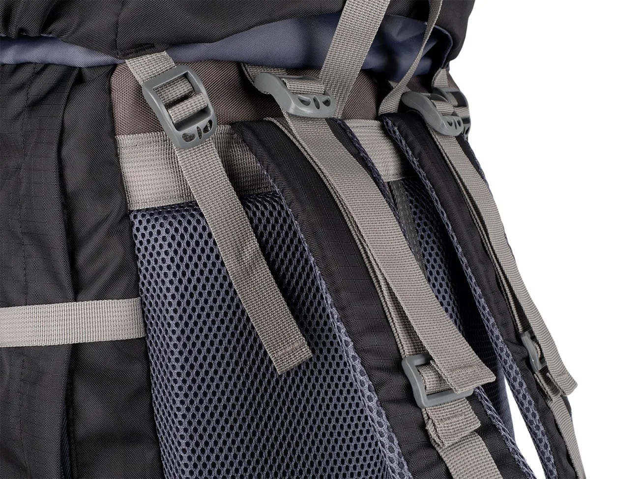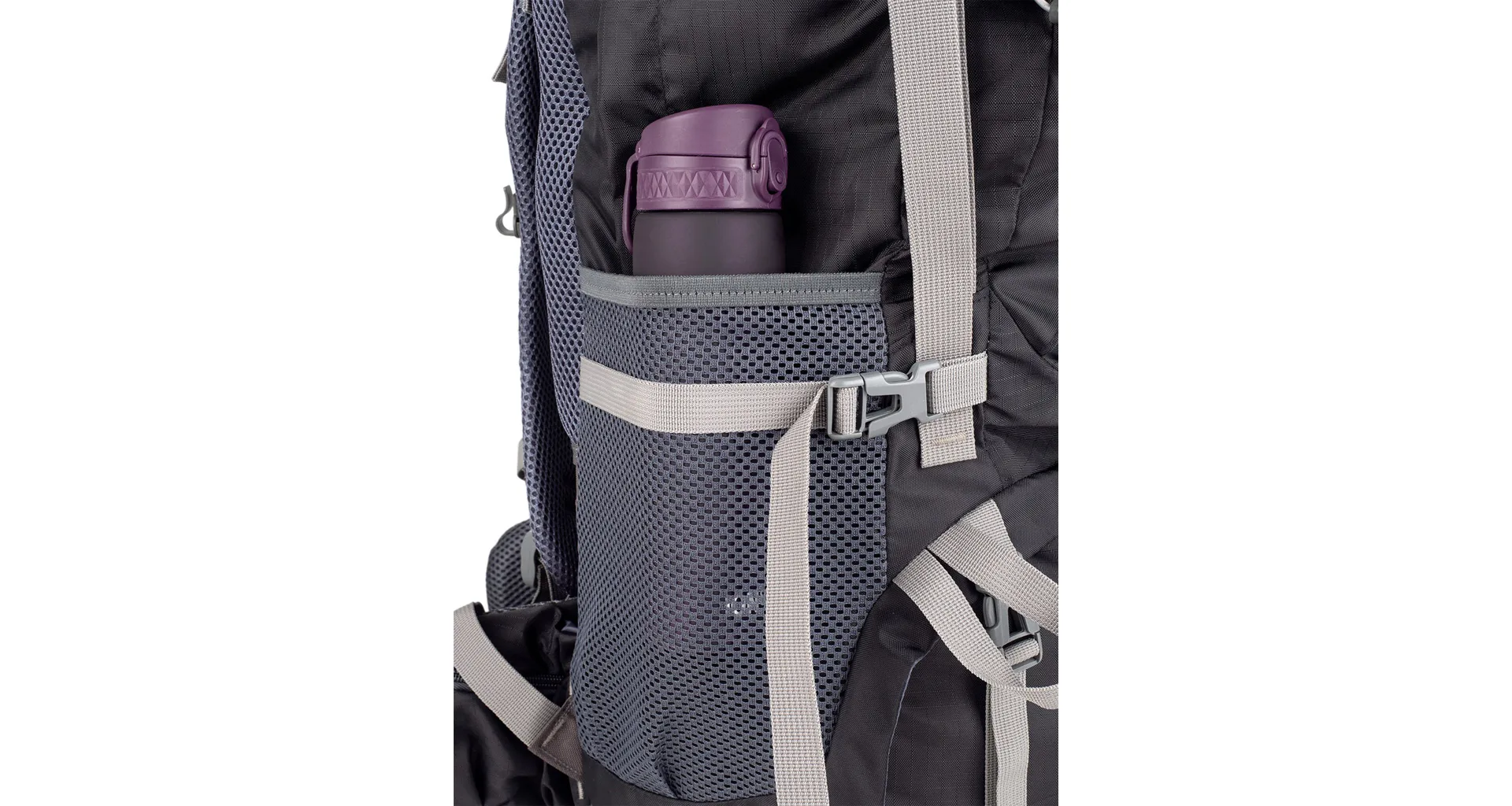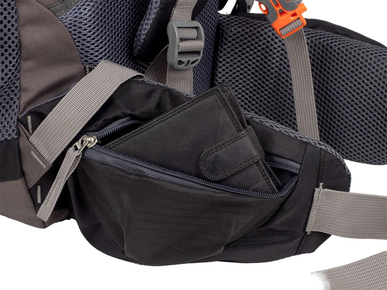 Do spodní části je přístup otevřením zipu na přední stěqně batohu. Vytvořený prostor slouží pro oddělení např. bot od ostatních použitých nebo špinavých věcí od ostatního nákladu. 2 velké síťované kapsy se stahovací pružinkou po stranách batohu a vpředu uprostřed umístěná svislá kapsa na zip umožňuje praktické rozmístění přenášených věcí.