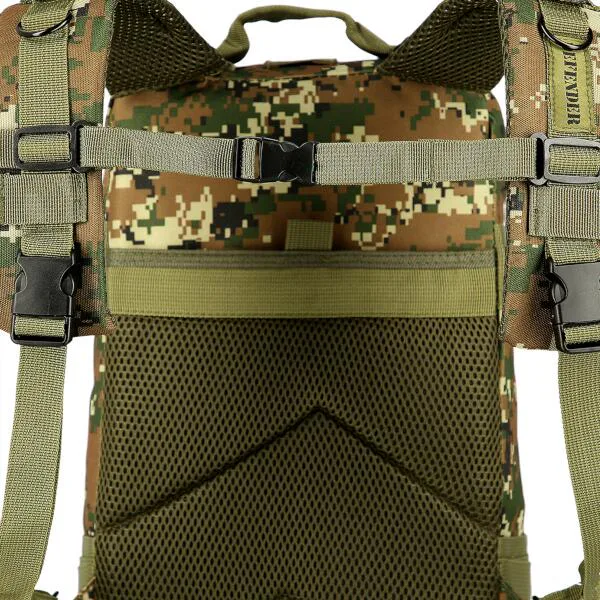 Polstrovaná zadní strana ze síťoviny je vybavena systémem NILS Vent, který zajišťuje cirkulaci vzduchu mezi batohem a zády, tím se snižuje jejich pocení. Pohodlné, polstrované popruhy jsou délkově a výškově nastavitelné. Na horní straně nalezneme pohodlné madlo pro přenášení batohu v ruce. Na batohu se nacházejí 3 kompresní popruhy, jejich stažením lze zmenšit objem zavazadla a zároveň se sníží tlak vyvíjený na švy a zipy v případě, že máme batoh plný. Na svislém kompresním popruhu je očko pro zavěšení příslušenství, jako je například blikačka. Po obvodu batohu se nachází elastická poutka, která lze použít k uchycení příslušenství jako jsou trekingové hole, svítilna, nůž s přezkou... Pro lepší rozložení nosnosti je batoh Defender vybaven hrudním a bederním pásem.