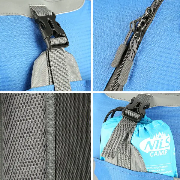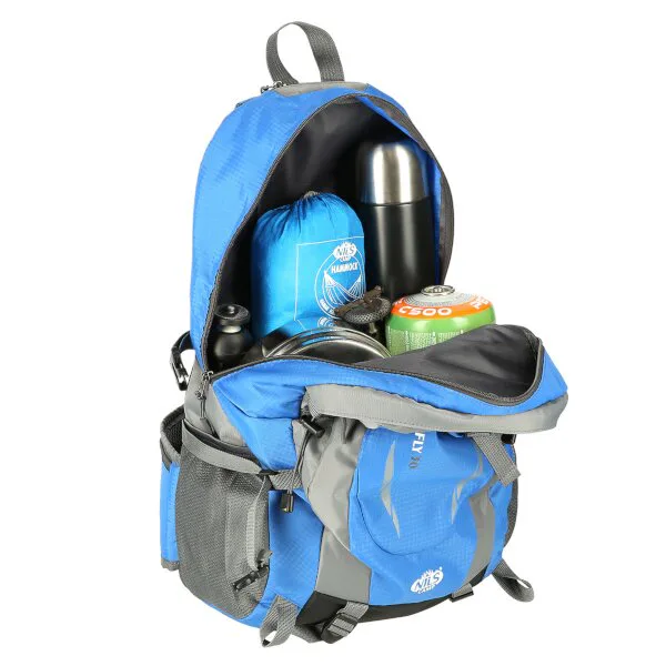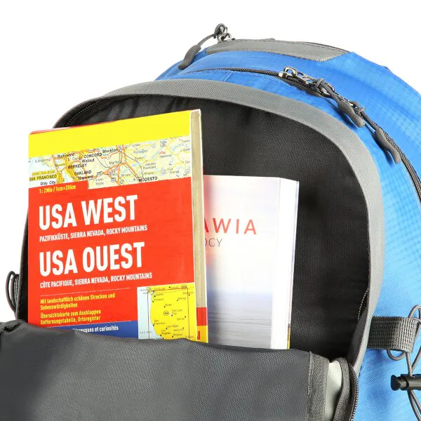 Přední kapsa je opatřena popruhem s přezkou a je určena na menší předměty jako je například peněženka, mobilní telefon nebo tablet. U poutka je malá kapsa na zip vhodná například pro svítilnu. Po stranách batohu se nachází 2 přihrádky, které pojmou například láhev s vodou, delší předměty lze dodatečně zafixovat popruhy s přezkou. Poutka po stranách slouží k uchycení turistických holí. Ze spodní strany batohu se nachází 2 délkově nastavitelné popruhy, které lze použít například k uchycení karimatky. Poslední 2 kapsičky na zip se nachází na bederním popruhu a lze je využít například na mince, nebo klíče od domu.