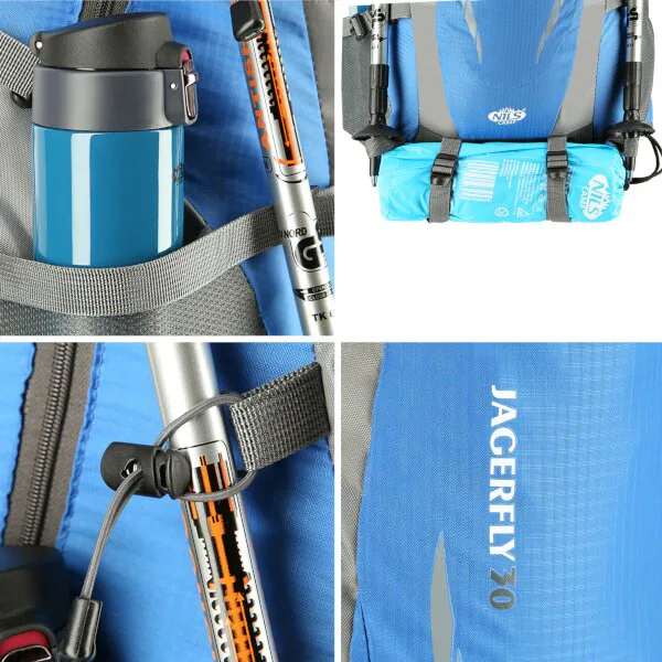 Polstrovaná zadní strana ze síťoviny je vybavena systémem NILS Vent, který zajišťuje cirkulaci vzduchu mezi batohem a zády, tím se snižuje jejich pocení. Pohodlné, polstrované popruhy jsou délkově nastavitelné. Na horní straně nalezneme pohodlné madlo pro přenášení batohu v ruce a poutko pro zavěšení batohu. Pro lepší rozložení nosnosti je batoh Jagerfly vybaven hrudním a bederním pásem.