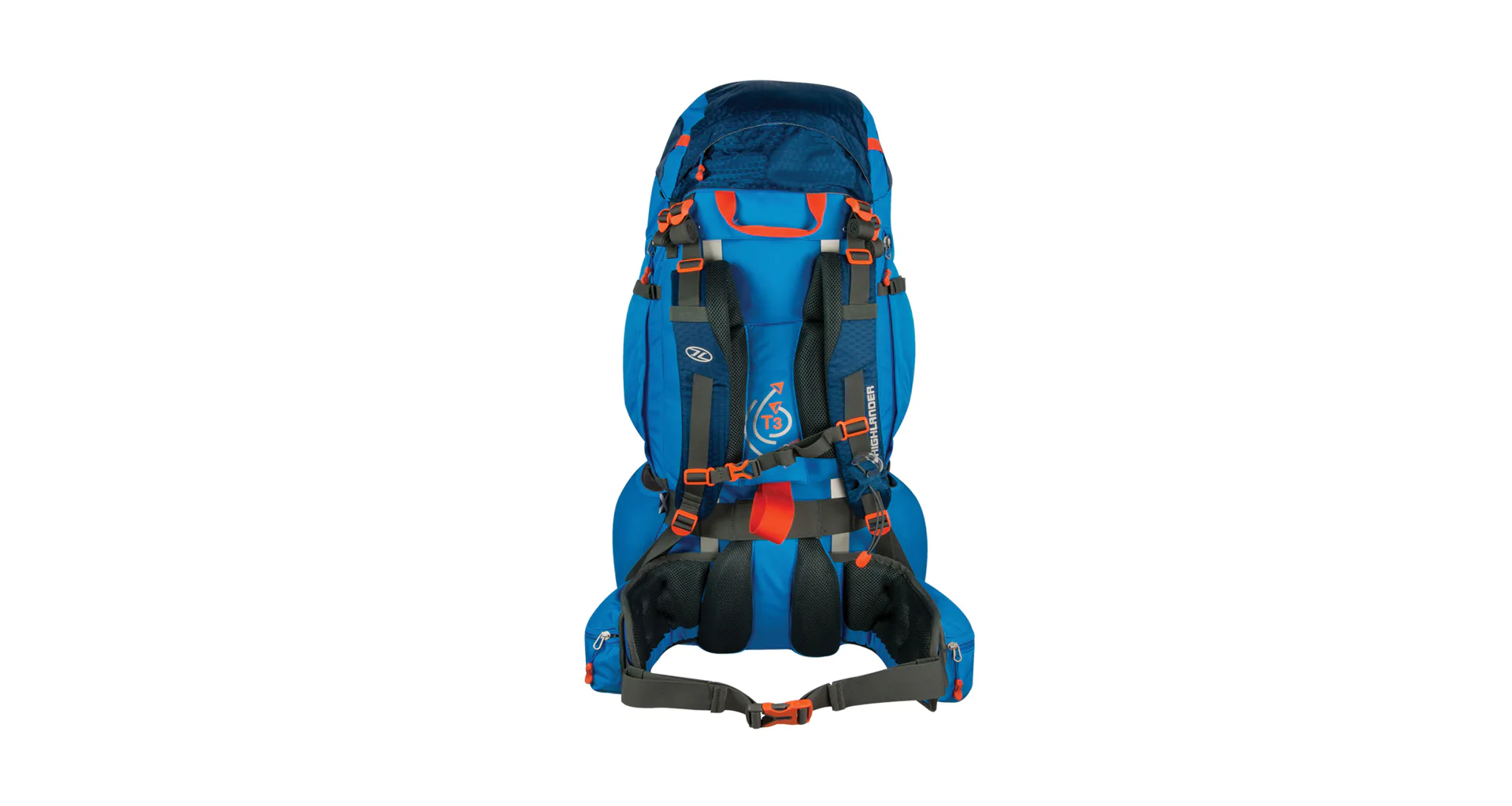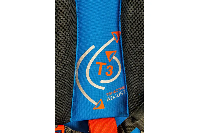 Systém T3 Tri Active Adjust pro dokonalé nastavení zádového systému doplňují popruhy na boku a vpředu, které pomáhají regulovat objem batohu. Široký polstrovaný bederní pás se dvěma kapsami. Voděodolný materiál ještě doplňuje vestavěná nepromokavá pláštěnka.
