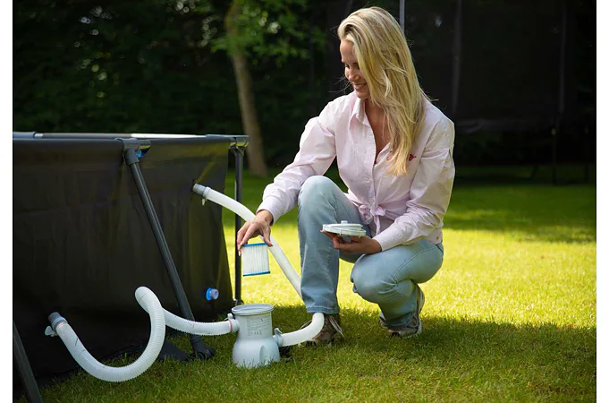 Součástí balení je filtrační čerpadlo s výkonem 1 136 litrů za hodinu a filtrační kartuše typu H, které pomáhají udržet vodu čistou po celou sezónu. Montáž bazénu je intuitivní a zabere v průměru pouhých 20 minut bez potřeby speciálního nářadí.