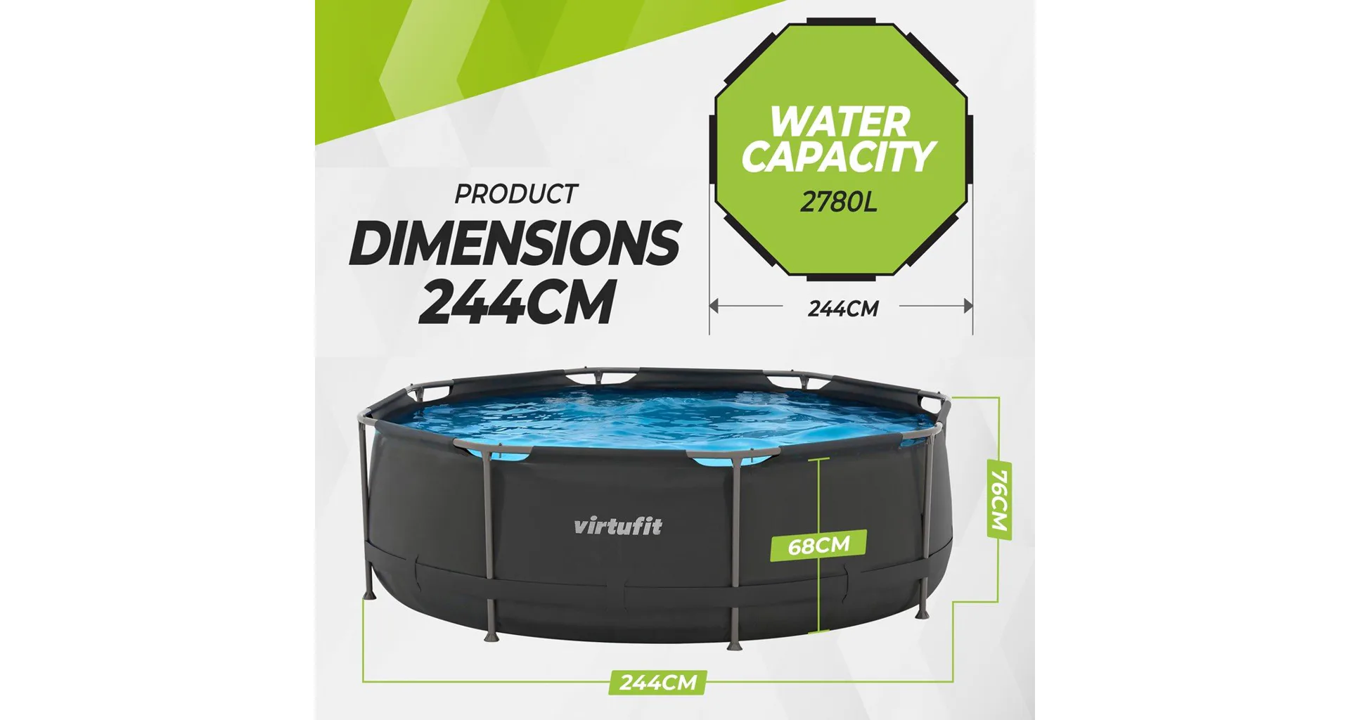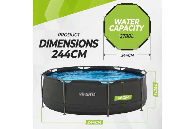 Bazén disponuje průměrem 244 cm, výškou 76 cm a objemem 2 780 litrů vody, což poskytuje dostatek prostoru pro relaxaci i zábavu. Stabilitu zajišťuje pevná ocelová konstrukce s trubkami o průměru 32 mm a kvalitní PVC materiál stěn a dna, který odolává běžnému zatížení i povětrnostním vlivům.