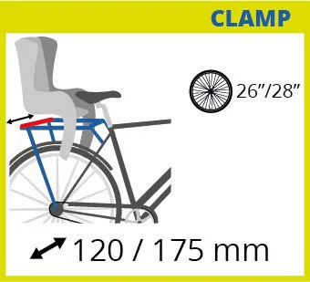 Sedačka je vhodná na kola s nosičem o šířce 120 - 175 mm a velikosti kol 26 " - 28".