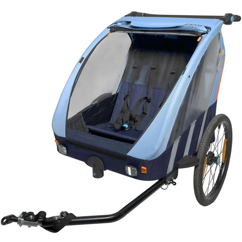 Vozík je vyrobený z nepromokavého pevného materiálu (PES 600D oxford) a v přední části je vybavený průhledným PVC oknem, dvě menší okna jsou i v boční části vozíku (kočárku), aby dítě (děti) mělo výhled z vozíku do okolí. Dále je vozík vybavený stahovací sluneční střechou a ochrannou síťovinou proti hmyzu pro použití v příznivém počasí. Vozík má dvě sedačky s 5-bodovými bezpečnostními pásy spojovanými jednou přezkou upevňující se na hrudníku dítěte. Přístup do vozíku je zepředu a je velmi pohodlný pro uložení dětí.