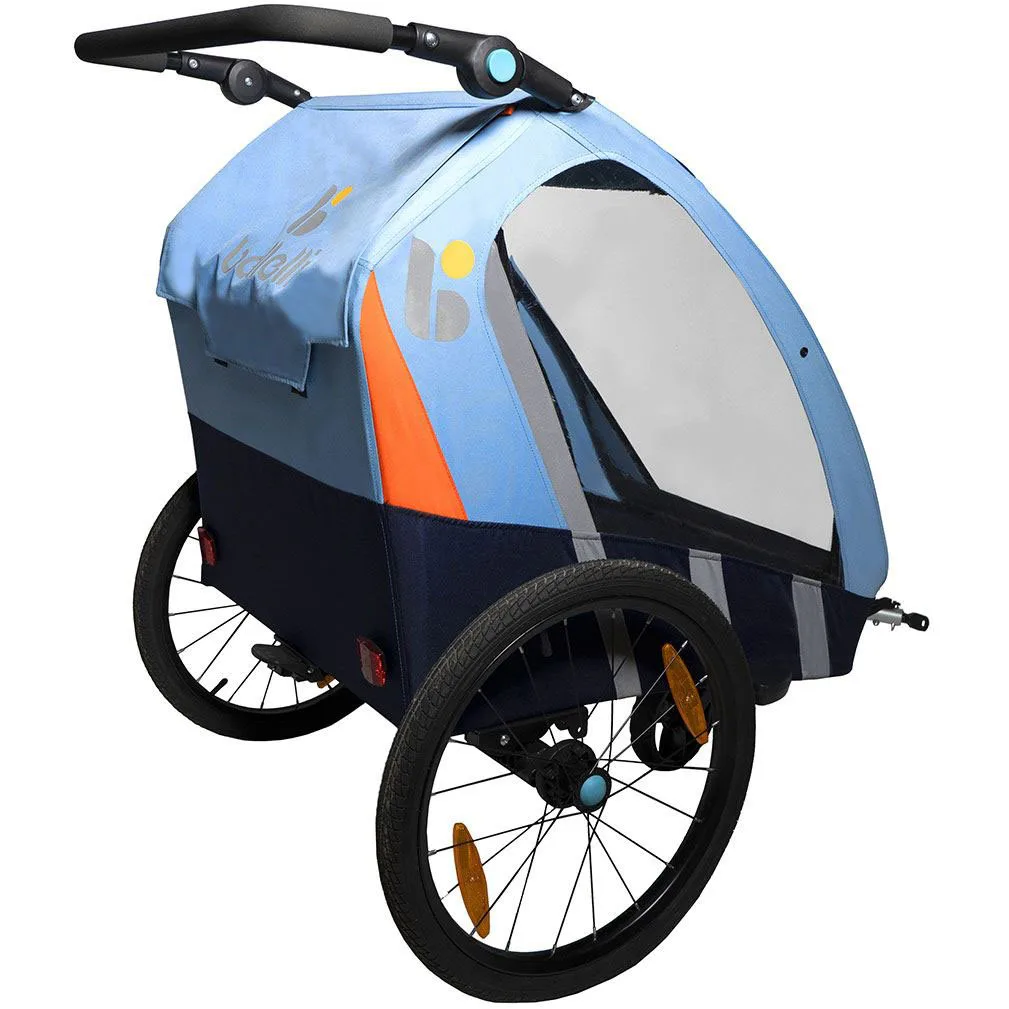 Dětský přívěsný vozík Bellelli Trailblazer (2v1) za jízdní kolo v kombinaci se sportovním kočárkem pro 2 děti je kvalitní model s veškerou certifikací pro provoz na pozemních komunikacích. Základem je dvoukolový vozík s tažnou ojí, kterou je možno nahradit třetím otočným kolečkem a tím vozík snadno a rychle změnit na sportovní kočárek pro dvě děti.