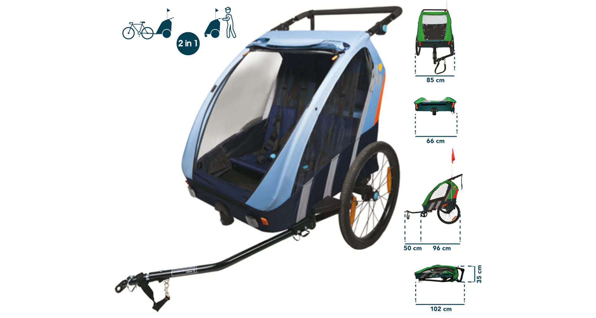 Vozík je opatřený dvěma stabilními 20" koly (+ jedním otočným přídavným kolem uloženým ve zvláštní kapse na vozíku). Dále má vozík velký úložní prostor v zadní části. Pevná a lehké konstrukce se snadnou možností přestavění vozíku na kočárek dělá z vozíku atraktivní prostředek umožňující sportovně založeným rodičům pohyb venku, a to i s malými dětmi. Vozík se upíná na osu zadního kola. Jako pojistka proti odpojení vozíku je součástí vybavení popruh s karabinou, která se upíná na rám kola a slouží pro zajištění vozíku proti odpojení i při uvolnění upínací matice.