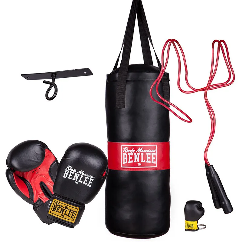 BEN LEE Boxovací set PUNCHY je určený pro menší děti od 6 let věku. Měkký, okolo 5 kg vážící boxovací pytel z umělé kůže je vhodný pro lehký nácvik úderů s nízkou intenzitou a díky tomu by nemělo dojít ke zranění ruky při úderu. Set obsahuje rukavice (velikost 6 OZ), švihadlo (velikost 200 cm), závěs na strop a klíčenku ve tvaru rukavice!