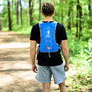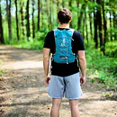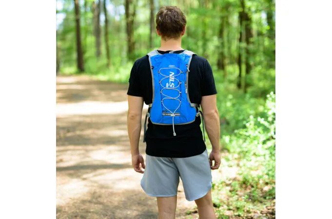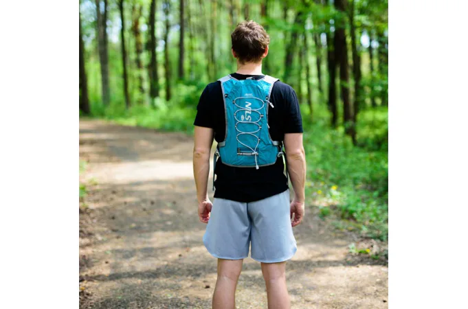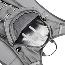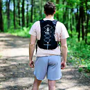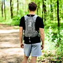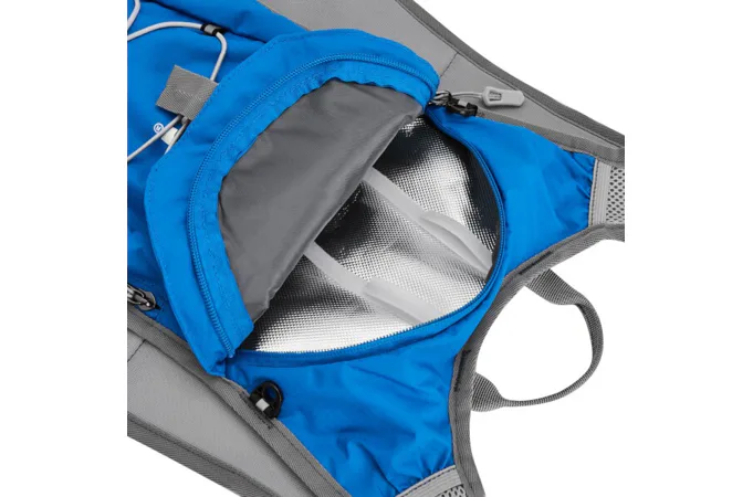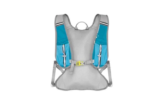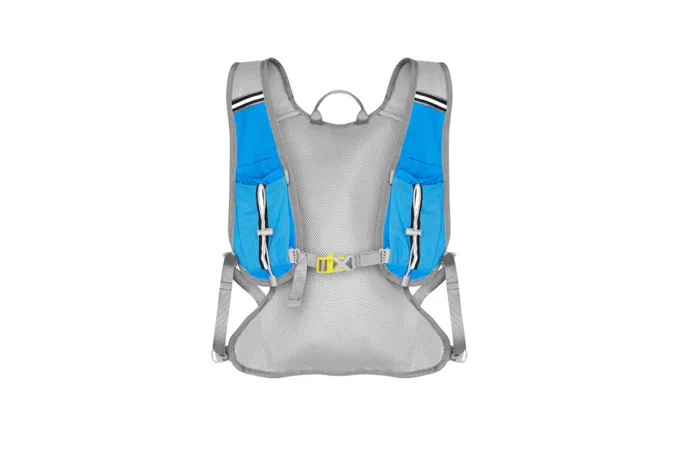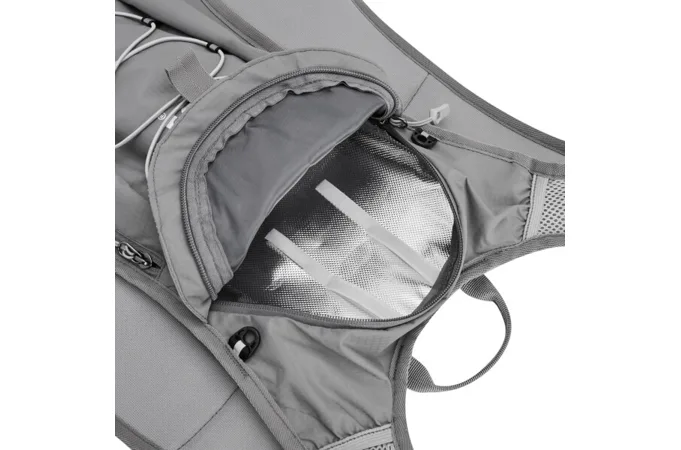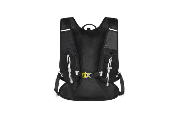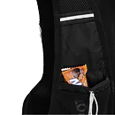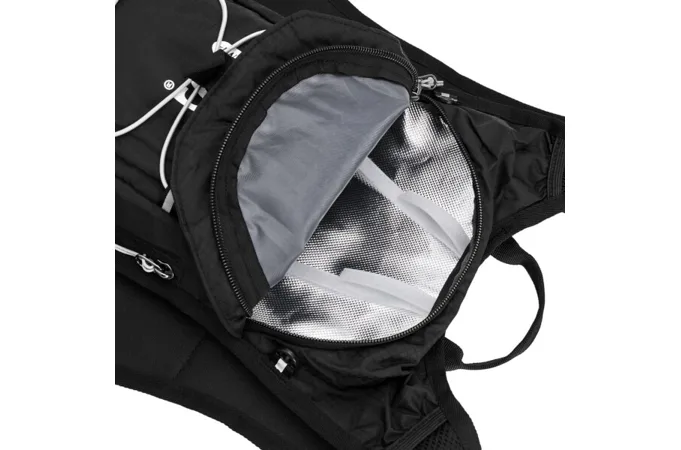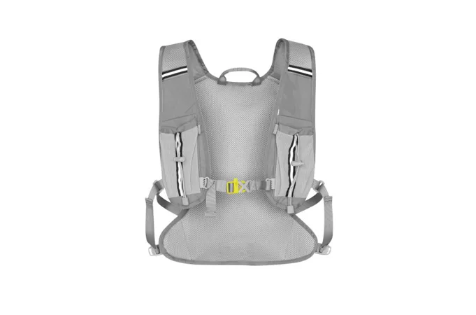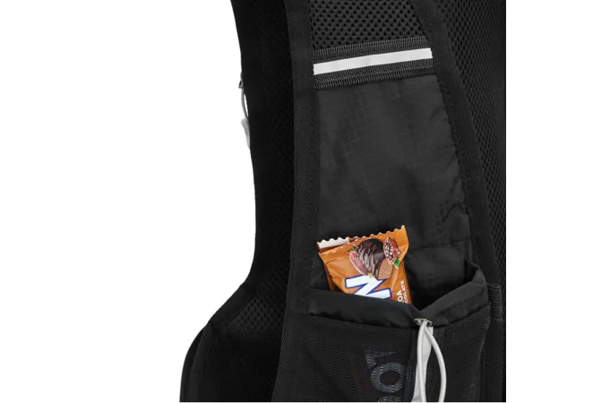 Na pravé straně se skrývá další kapsa na zip, která je ideální pro telefon, peněženku, nebo například klíče. Na horní straně batohu je poutko pro snadné přenášení batohu v ruce. Záda a ramenní popruhy jsou vyrobeny ze síťoviny doplněné o prodyšnou pěnu, která zvyšuje prodyšnost panelu a záda se budou méně potit. Ramenní popruhy jsou opatřeny reflexními řemínky pro protažení hadičky od hydrovaku a kapsami ze síťoviny. Na levém popruhu se navíc nachází kapsička s průhlednou čelní stranou, do které lze uložit například kartičku pro případ ztráty, startovní číslo a podobně. Ramenní popruhy jsou spojeny hrudním pásem, který lze výškově nastavit. Popruh je spojen plastovou přezkou s píšťalkou.
