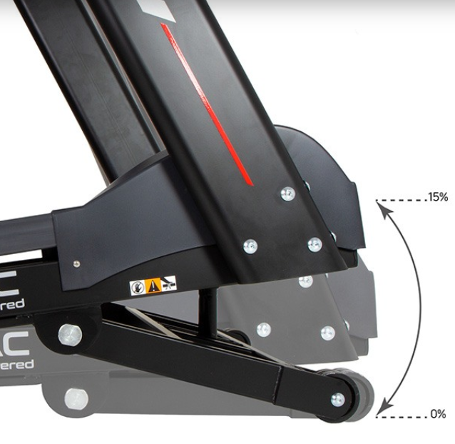 Trenažér má velmi kvalitní AC motor s maximálním výkonem 5HP (trvalý výkon 3,5 HP/2,57 kW). Rychlost lze upravovat v rozmezí 1-22 km/h. Prostorná běžecká plocha s rozměry 55 x 155 cm je vybavena kvalitním tlumícím systémem Flex a SmartKonik. Sklon je elektronicky nastavitelný do 15 %.
