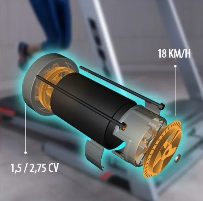 Trenažér má kvalitní značkový motor s maximálním výkonem 2,75 HP umožňujcící na pásu běhat rychlostí 1 až 18 km/h.