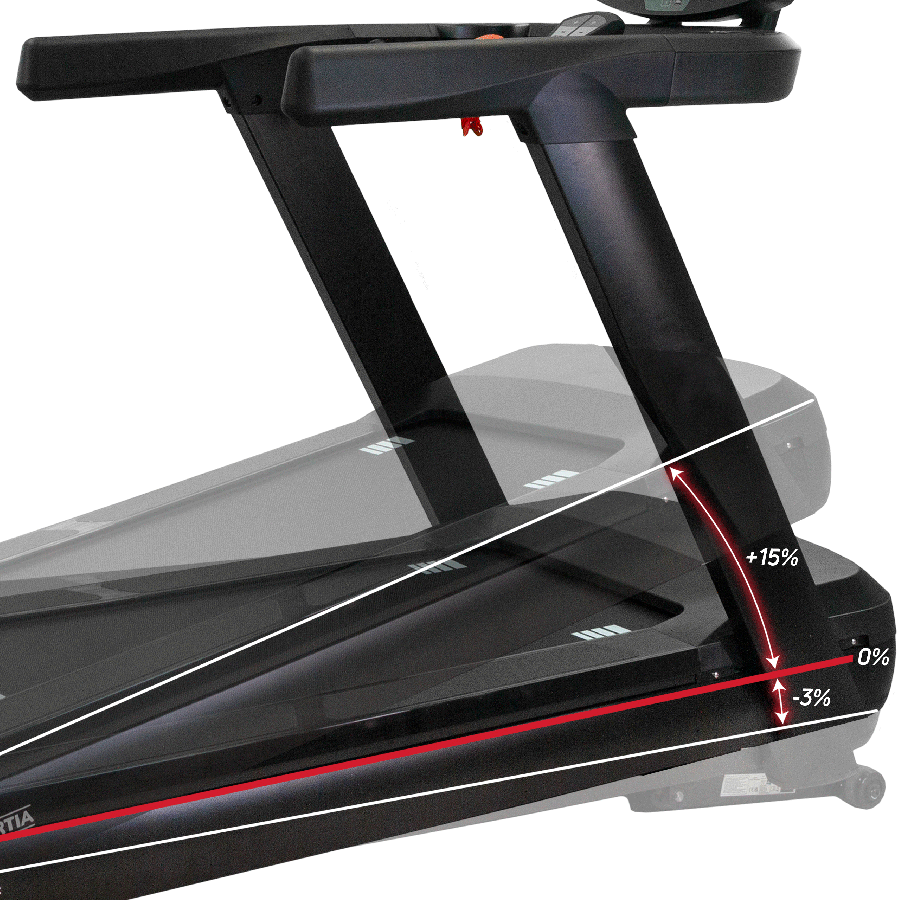 Díky střídavému AC motoru s maximálním výkonem 9 HP (trvalý výkon 5 HP), který je určen do komerčního provozu, umožňuje stroj dlouhodobě využívat rychlost v rozmezí 0,8 - 25 km/h při sklonu -3 % až 15 %. Prostorná, odpružená běžecká plocha má rozměry 58 x 160 cm.