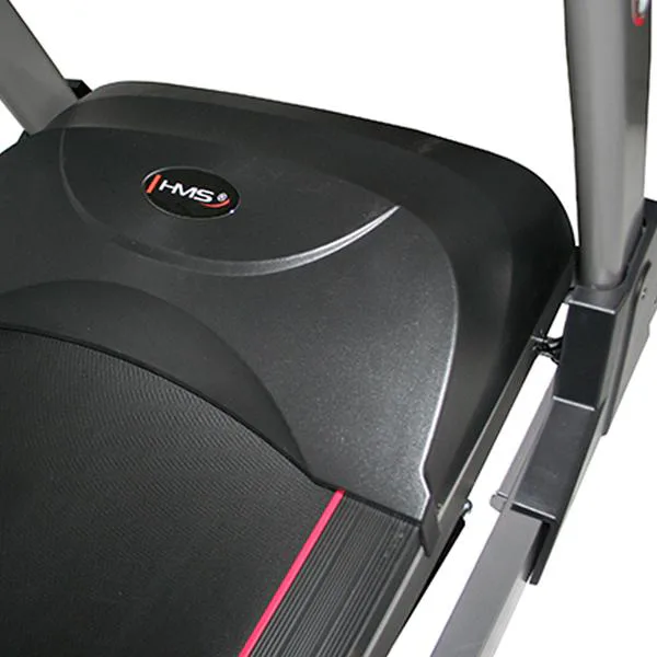 Běžecký pás HMS BE 8535 je moderní, robustní běžecký trenažér s možností snadného složení a snímači tepové frekvence v rukojetích. Tichý motor s výkonem 3,5 HP zaručí maximální rychlost 22 km/h. Odpružená běžecká plocha s možností elektronického zdvihu pásu, nabízí dostatek komfortu pro každodenní trénink. Veškeré potřebné informace vám přehledně zobrazí podsvícený LED displej, pod který si díky praktické opěrce můžete umístit například tablet. Výhodou jsou zabudovaná kolečka pro snadný přesun pásu na požadované místo. Díky těmto vlastnostem je běžecký pás HMS BE 8535 vhodným doplněním každé domácí posilovny.
