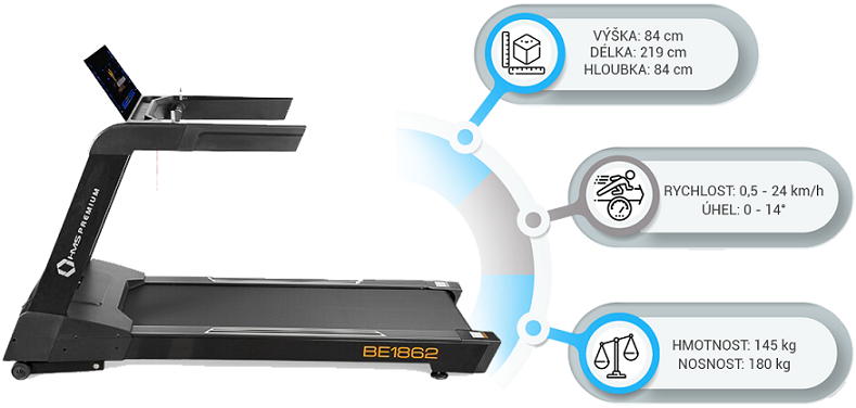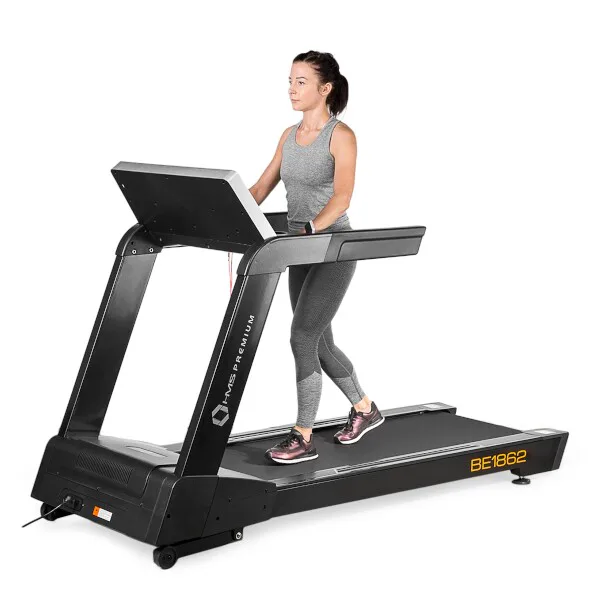 Trenažér HMS BE1862 je běžecký pás, který spadá do kategorie Semi-commercial a je vhodný do domácností, soukromých klubů, hotelových posiloven atd.. Trenažér disponuje velkou běžeckou plochou o rozměrech 56 x 157 cm umístěnou na konstrukci, která je od hlavního rámu odpružená pomocí vnitřního "polštáře". Funkční systém odpružení zajišťuje pohodlí během tréninku a výrazně snižuje zatěžování kloubů. Rychlost běhounu je plynule nastavitelná v rozsahu 0,5 - 24 km/h. Běžecký pás BE1862 je tak vhodný jak pro úplné začátečníky, tak i pro pokročilé běžce. Pro opravdu náročný trénink je trenažér vybaven elektronickou regulací náklonu v rozsahu 0° - 15° a lze jej plynule nastavit pomocí tlačítek na ovládacím panelu.