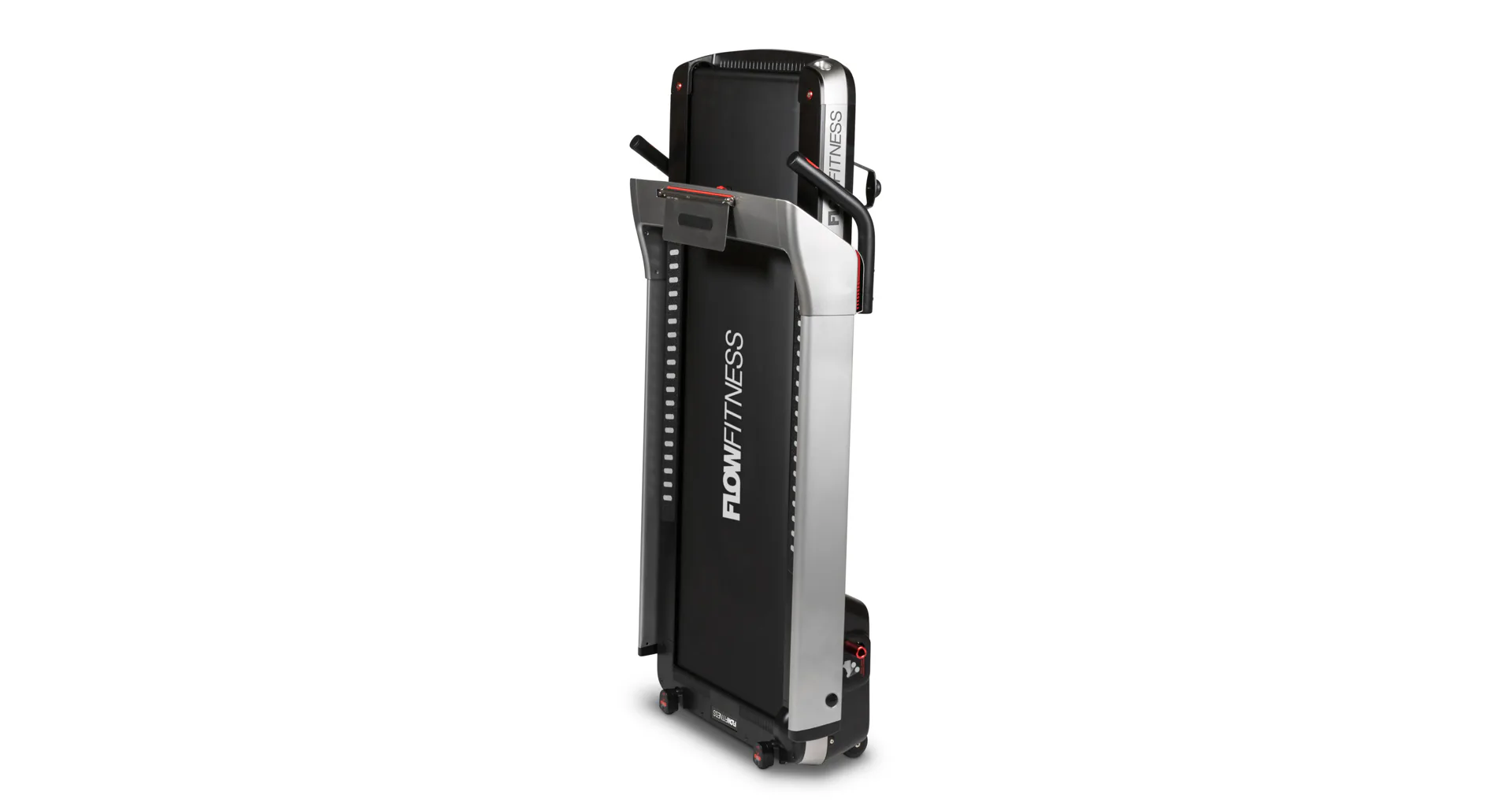 Běžecký pás Flow Fitness DTM400i disponuje dotykovým displejem, držákem na tablet/smartphone, bluetooth přijímačem a transportními kolečky.