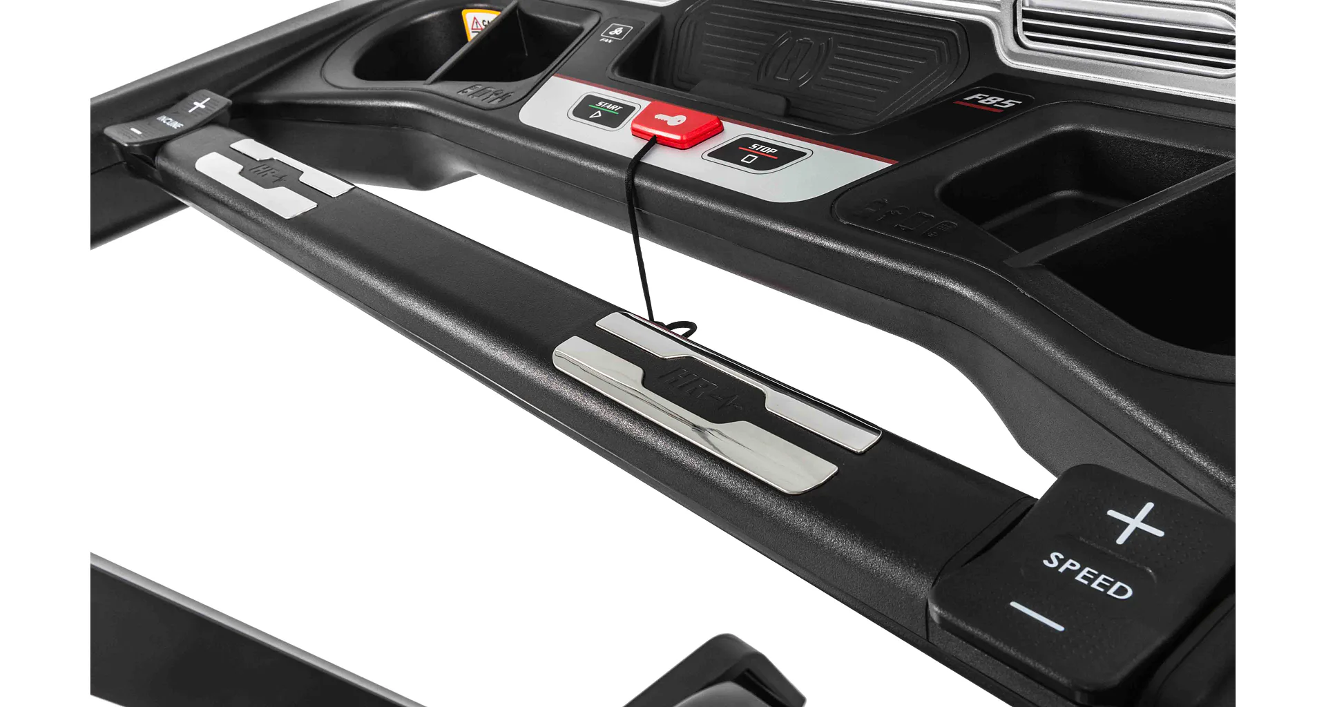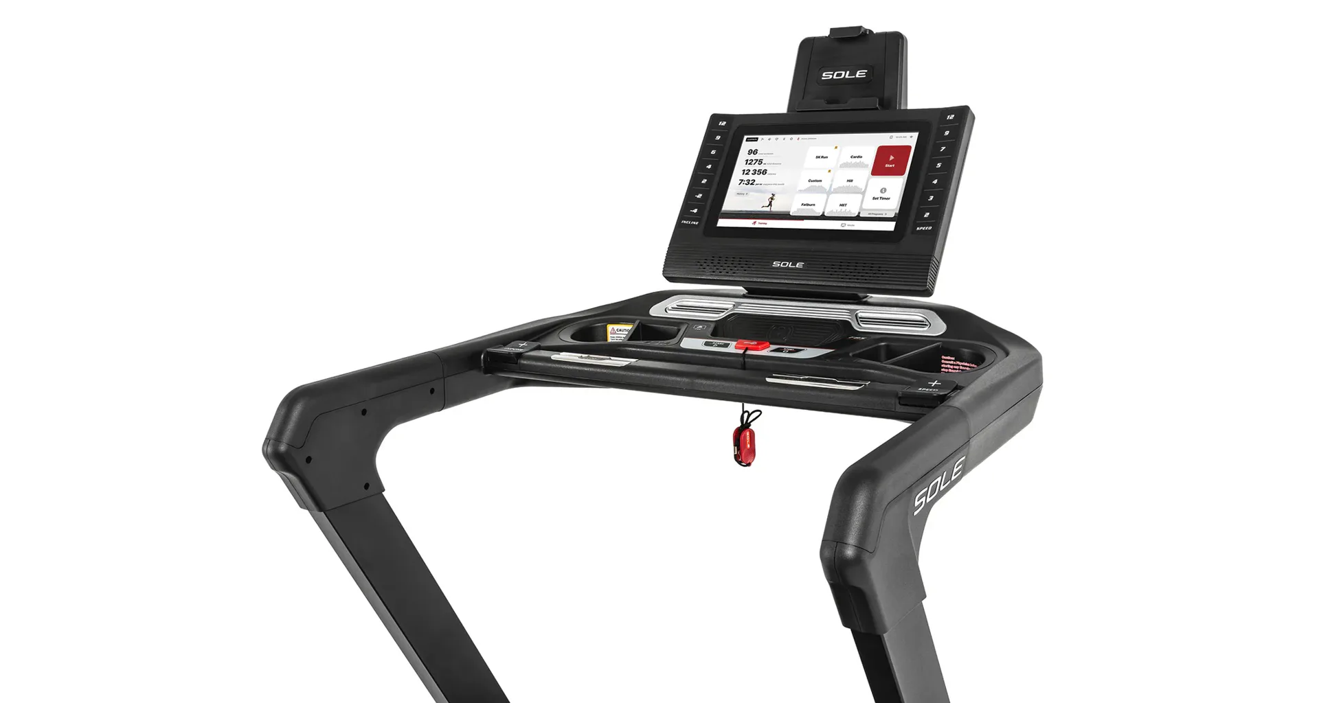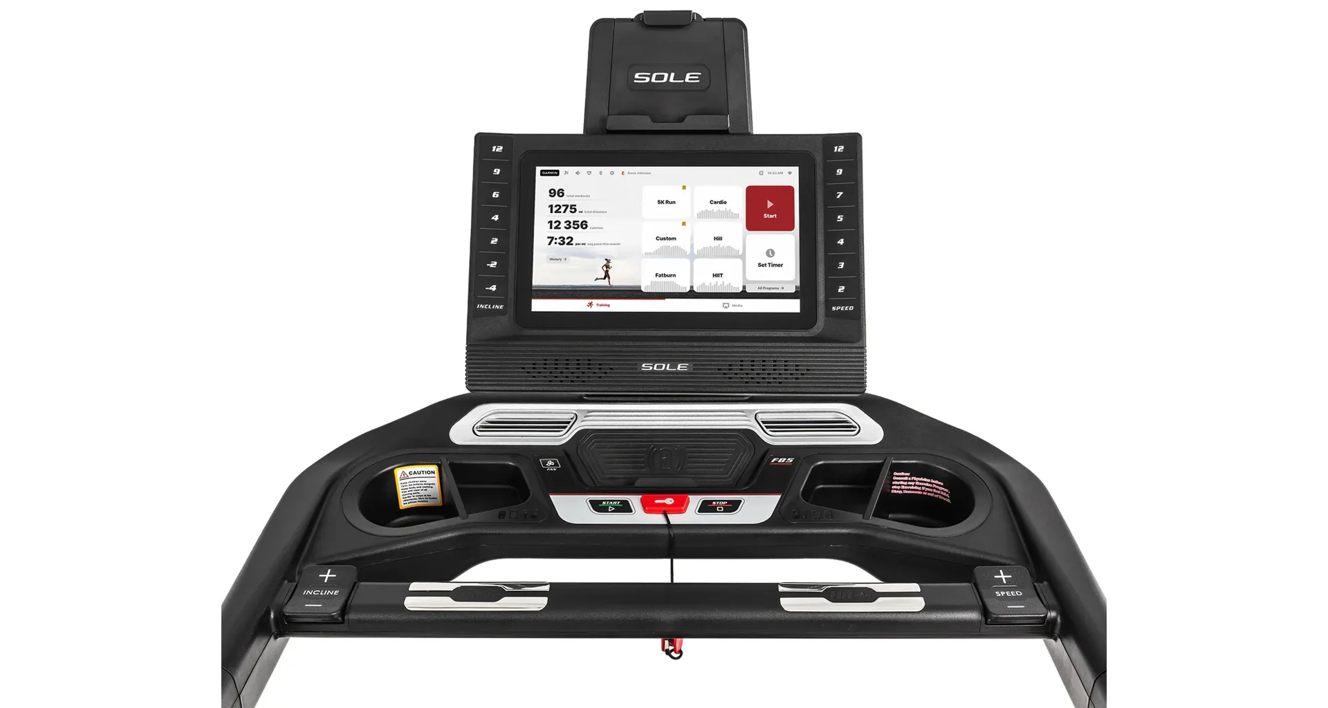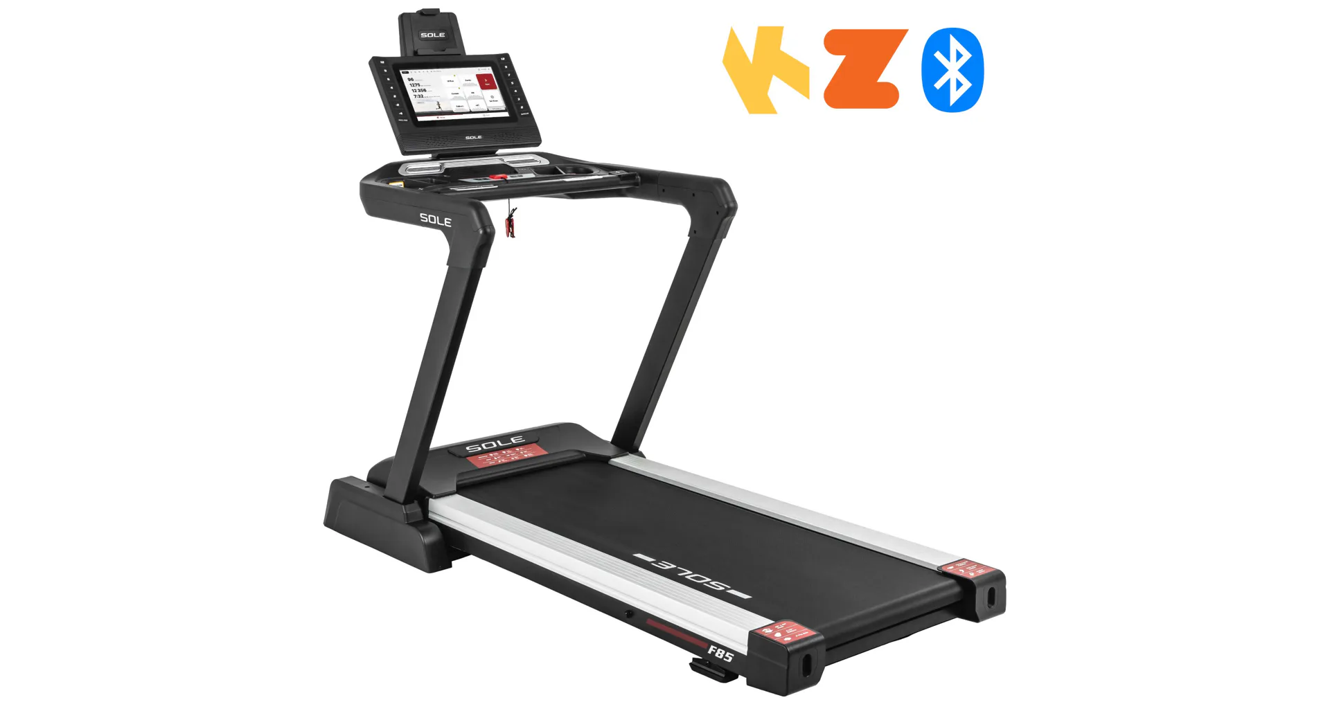 HAMMER SOLE F85 je vystrojen přehledým počítačem s 15,6" TFT dotykovým displejem, který nabízí 12 přednastavených programů a HRC programy. Měření tepové frekvence je možné prostřednictvím senzorů na madlech nebo bezdrátově 5 kHz hrudním pásem. Pro zpestření vašeho tréninku můžete běžecký pás přes Bluetooth připojit k tréninkovým aplikacím Kinomap a Zwift a udělat tak váš trénink pestřejší a zábavnější. Aplikace automaticky přizpůsobuje odpor a nastavuje sklon dle vybrané tratě. Nedílnou součástí počítače je i držák na tablet/smartphone, USB port pro nabíjení, reproduktory.