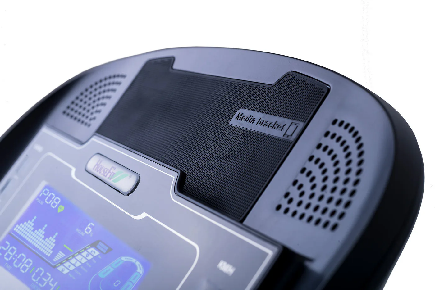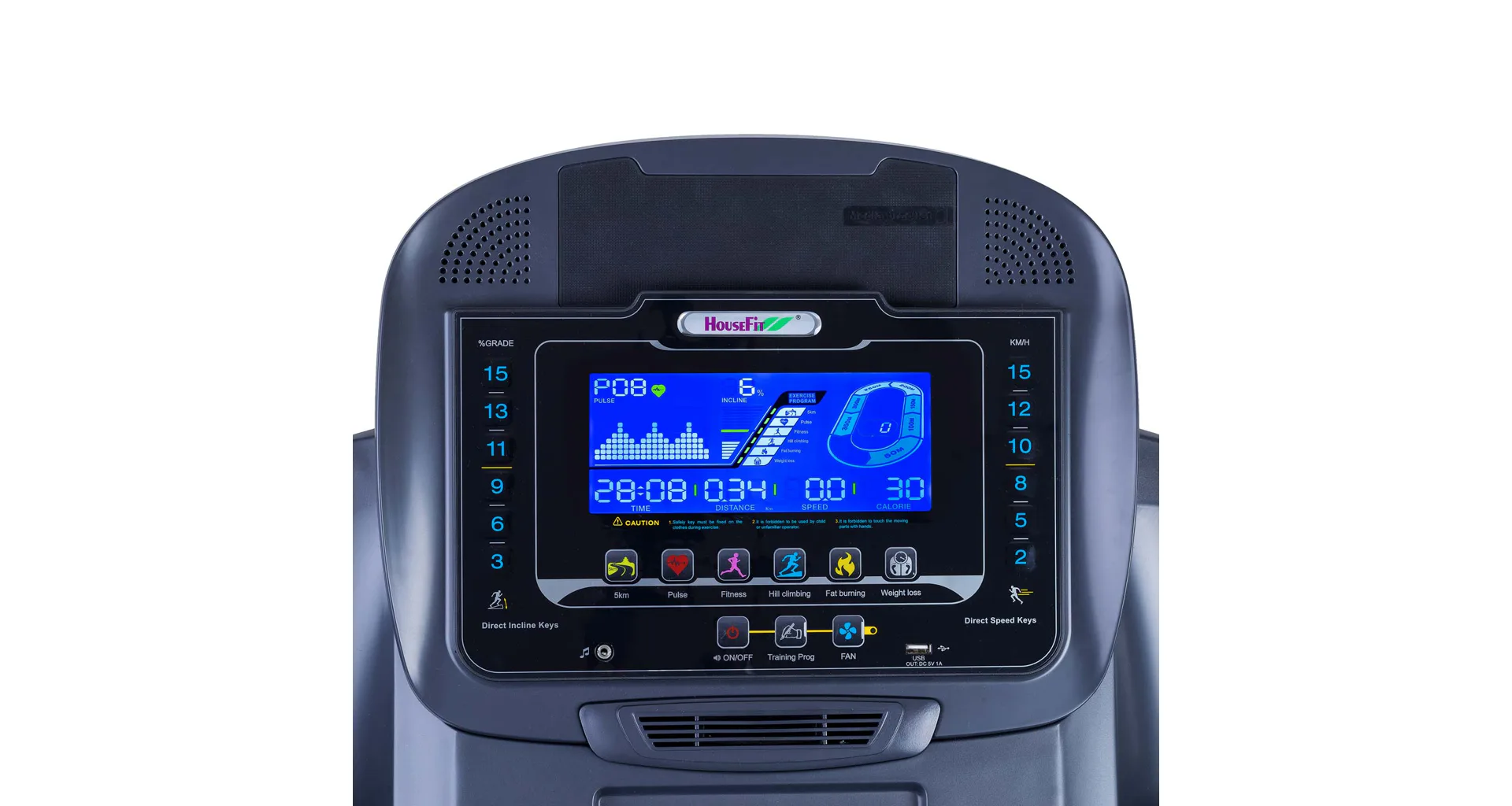 HOUSEFIT SPIRO 80 iRun má 7" velký, přehledný LCD podsvícený barevný displej, který zobrazuje hodnoty jako čas, vzdálenost, sklon, rychlost, spotřeba kalorií a měření tepové frekvence.