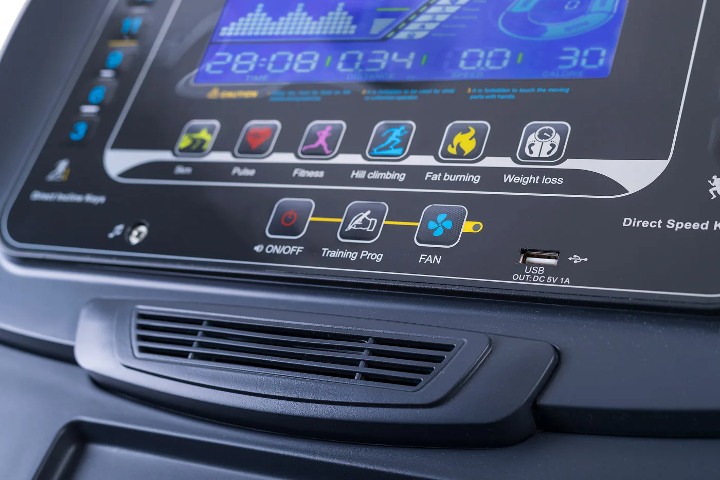 Běžecký pás HOUSEFIT SPIRO 80 iRun má vestavěný ventilátor pro jemné osvěžení a komfortnější běh.
