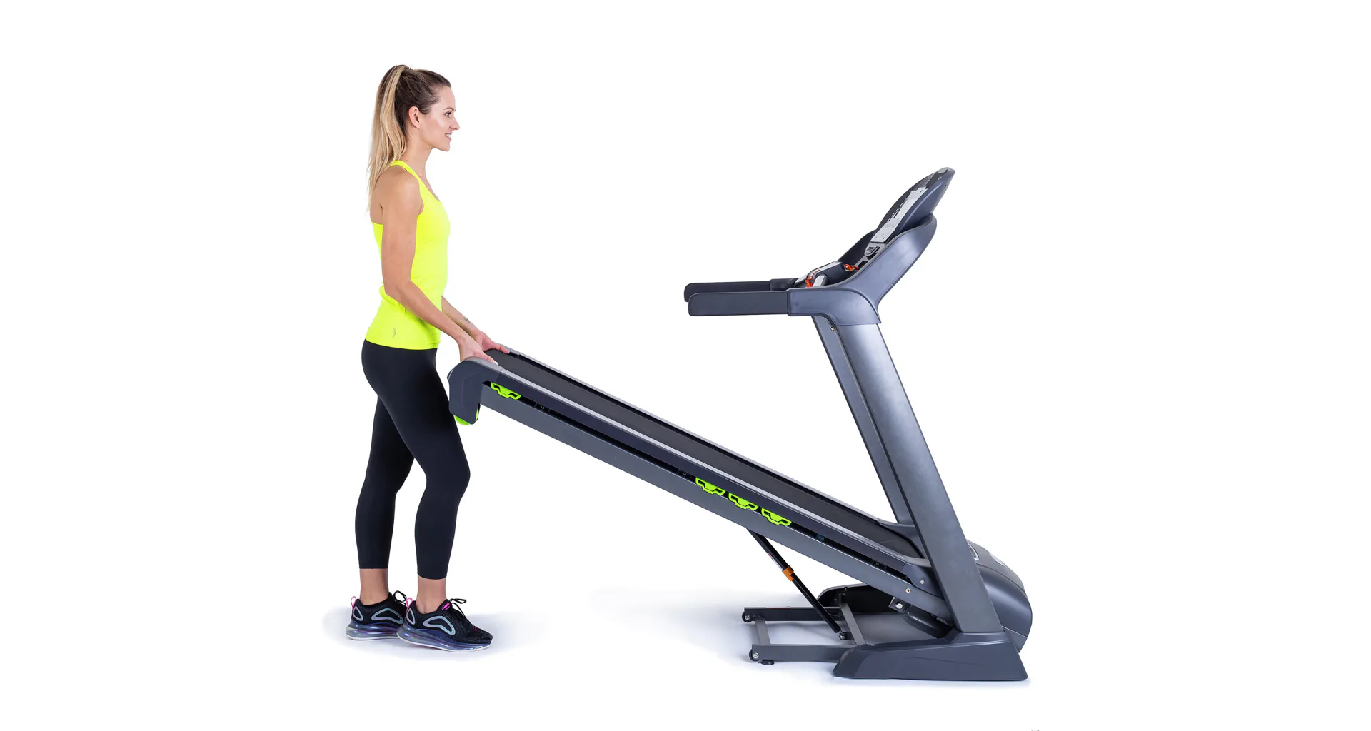 Sklopením pásu ušetříte polovinu prostoru, když zrovna neběháte. Na sklopení je zapotřebí minimální síly a umožňuje snadnou manipulaci i ženám.