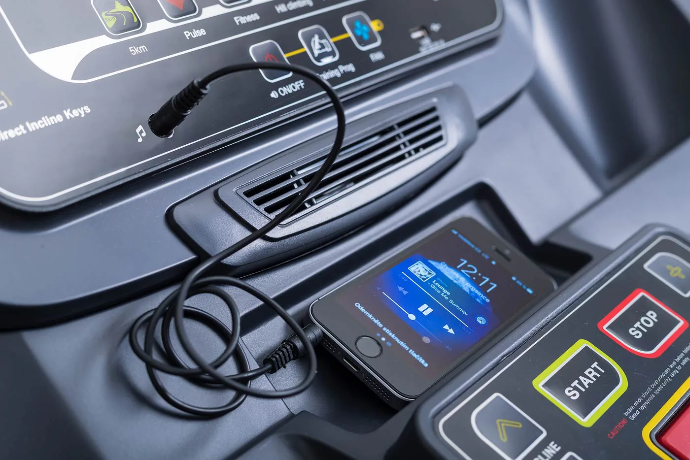 Trenažér má vestavěné reproduktory pro připojení MP3, smartphonu, či iPodu. Součástí je kabel (3,5 jack) pro připojení vašeho telefonu k MP3. Můžete tak poslouchat hudbu pro větší zábavu při běhání.