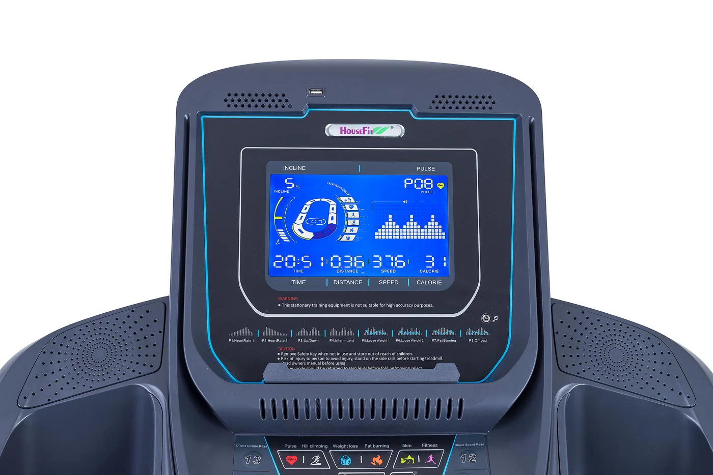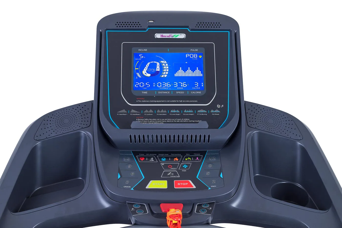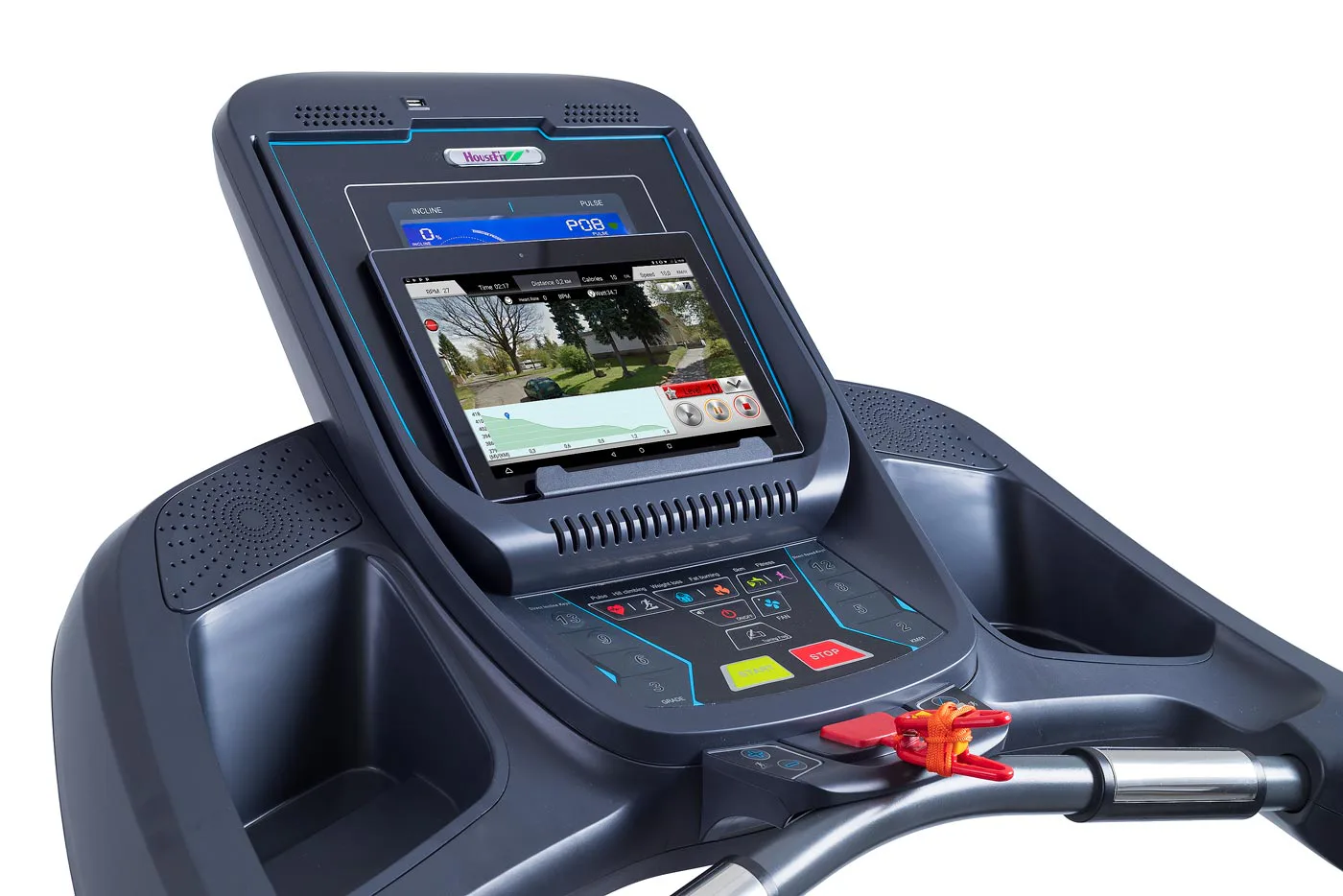 HOUSEFIT SPIRO 90 iRun má 8" velký, přehledný LCD podsvícený barevný displej, který zobrazuje hodnoty jako čas, vzdálenost, sklon, rychlost, spotřeba kalorií a měření tepové frekvence.