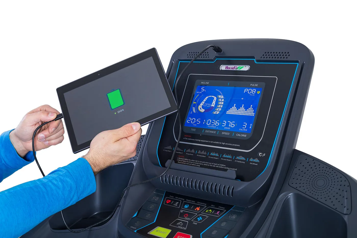 Nemusíte se tak bát, že se Vám při tréninku vybije tablet při sledování filmu, poslechu hudby či využívání tréninkové aplikace.