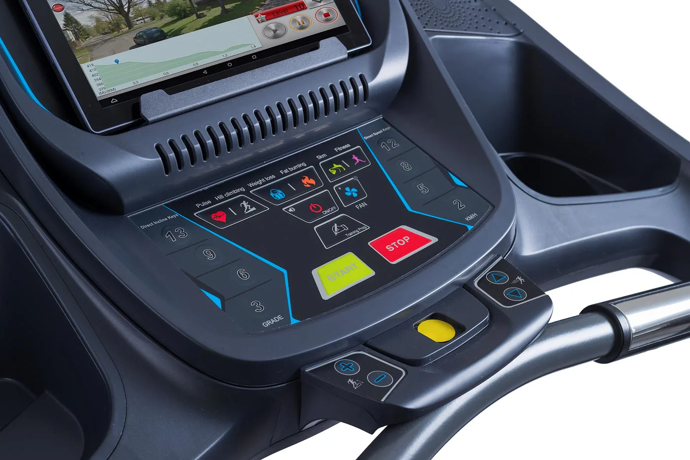 Počítač stroje je po stranách vybaven tlačítky pro rychlou volbu rychlosti a sklonu. Nemusíte tak 10x mačkat tlačítko "+", ale jednoduše zmáčknete požadovaný sklon, nebo rychlost kterou chcete běžet a pás na ni postupně zrychluje.