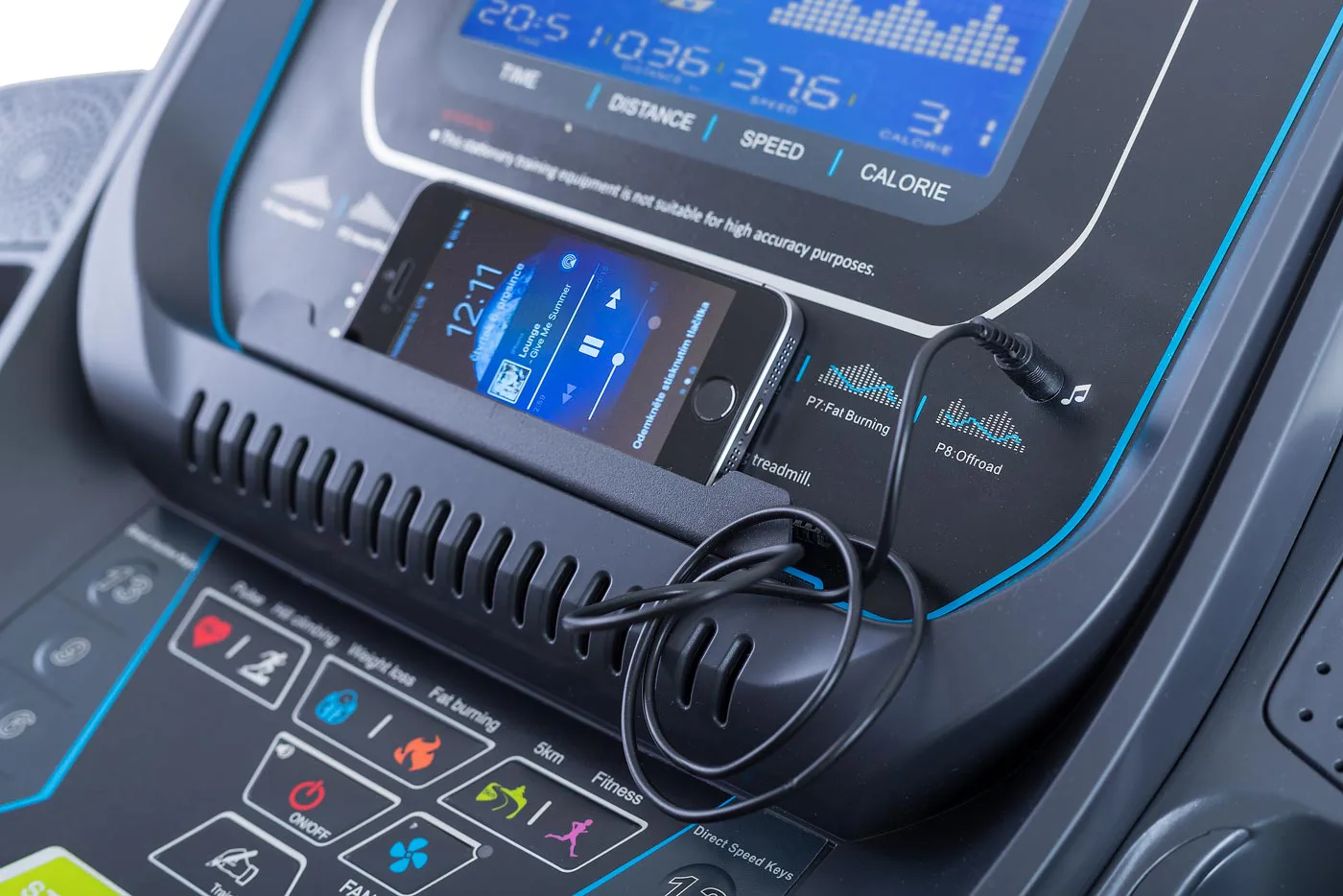 Trenažér má vestavěné reproduktory pro připojení MP3, iPodu. Součástí je kabel (3,5 jack) pro připojení vašeho telefonu k MP3 připojení.