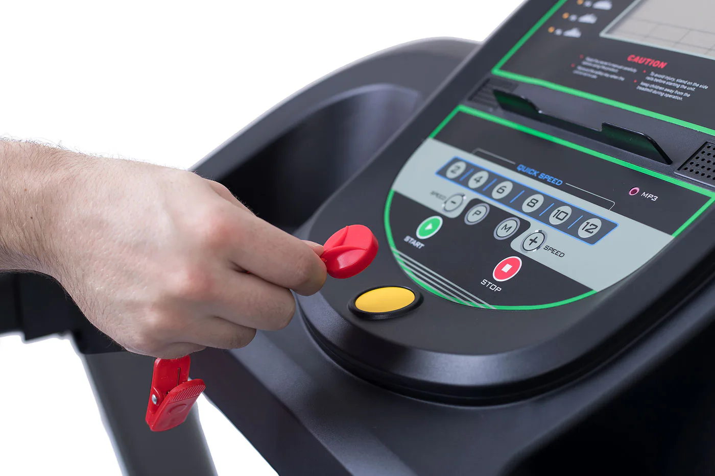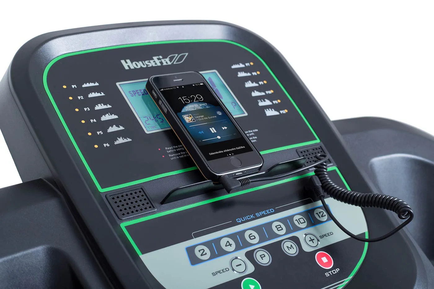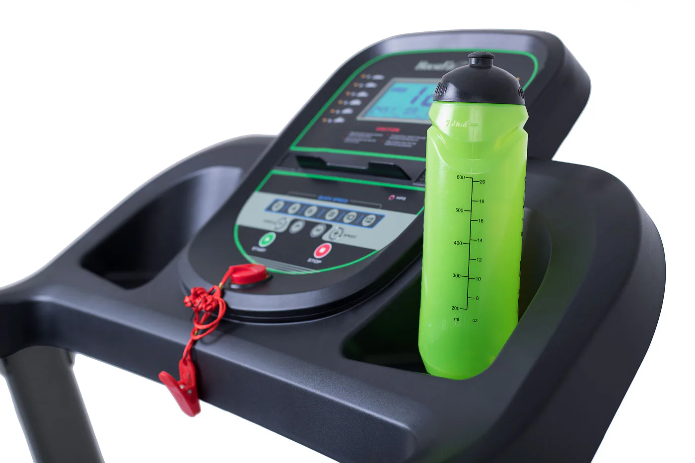 Dále nabízí možnost připojení MP3 pro poslech hudby prostřednictvím vestavěných reproduktorů, 2 držáky na láhev s vodou a bezpečnostní pojistku pro okamžité zastavení pásu.