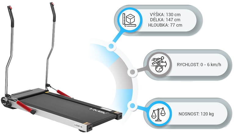Chodící trenažér HMS LOOP15 s integrovanými holemi Nordic walking je inovativním modelem pro domácí použití, který se od šedivé konkurence odlišuje dvěmi pohyblivými madly, pomocí kterých můžeme trénovat Nordic walking v klidu domova. Nordic walking zapojuje do pohybu mnohem více svalů, než běžná chůze, proto je o mnoho efektivnější při spalování tuků a budování kondice než právě běžná chůze. Madla jsou opatřeny písty, které zaručují plynulejší pohyb při minimálním odporu. Maximální rychlost HMS LOOP15 je 6 km/h a její plynulá regulace se provádí pomocí tlačítek na koncích madel. Podlouhlý displej zobrazuje přehledně veškeré potřebné údaje (rychlost, čas tréninku, vzdálenost, počet kroků a počet spálených kalorií).