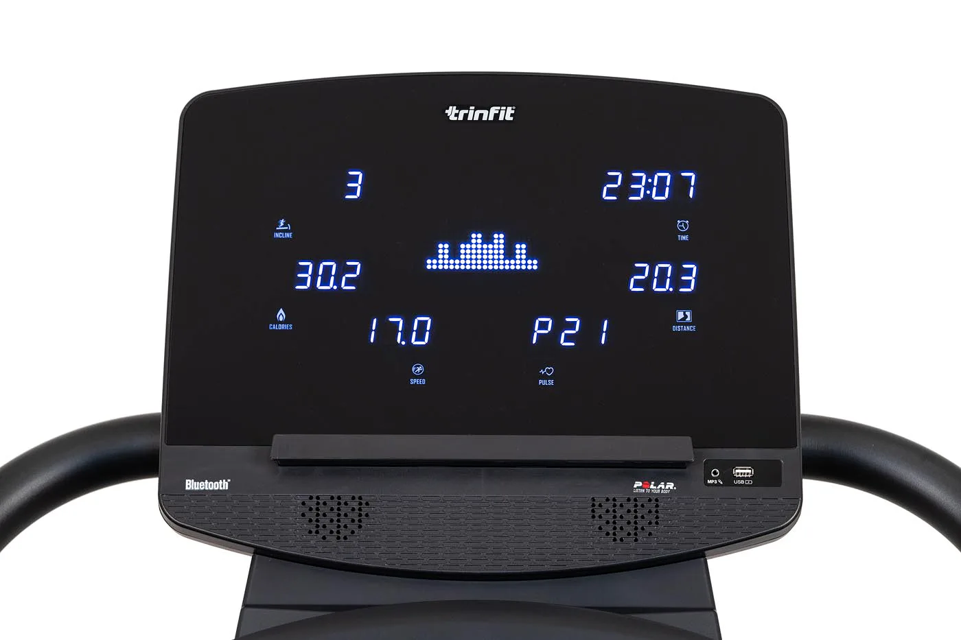TRINFIT T5 Pro nabízí velký, přehledný a podsvětlený LCD displej s bohatou programovou nabídkou pro efektivní a zábavný trénink. Umožní vám sledovat váš trénink v reálném čase pomocí dat monitorujících vaši rychlost, čas, vzdálenost, spálené kalorie a srdeční frekvenci a řadou tréninkových programů, které si můžete nastavit dle tepové frekvence či dle jiných parametrů.
