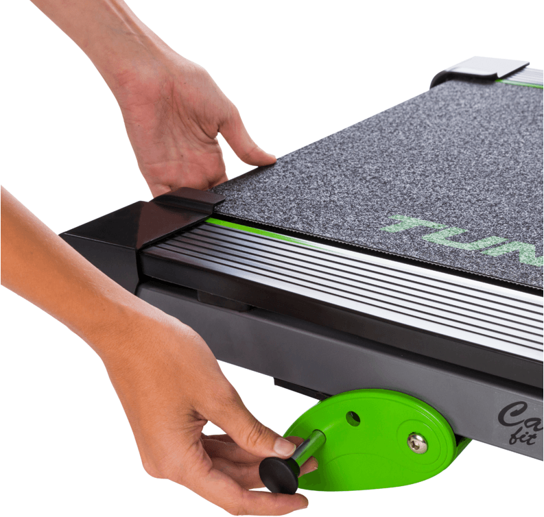 Trenažér TUNTURI Cardio Fit T30 nabízí manuálně nastavitelný sklon do 8%., simuluje tedy běh do kopce či po rovně. Stroj je vybaven transportními kolečky pro snazší manipulaci a má možnost složení.