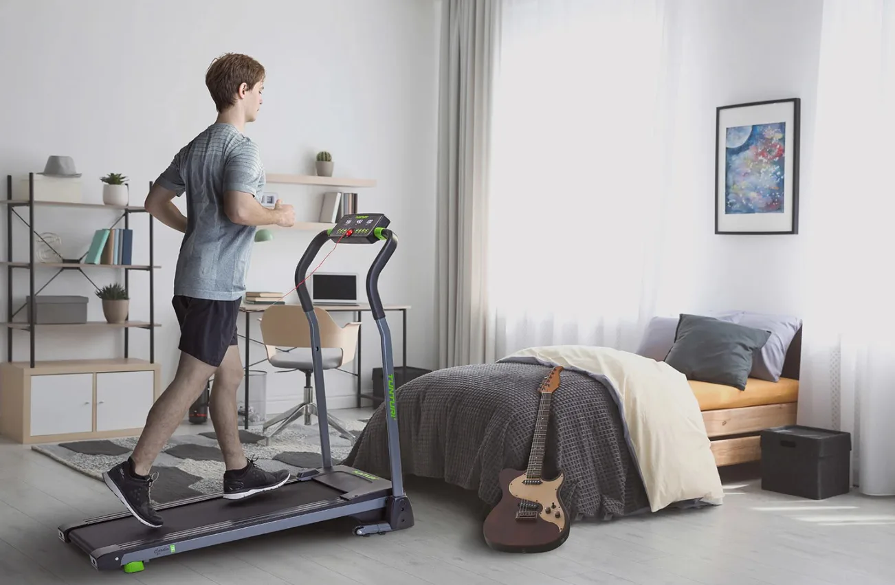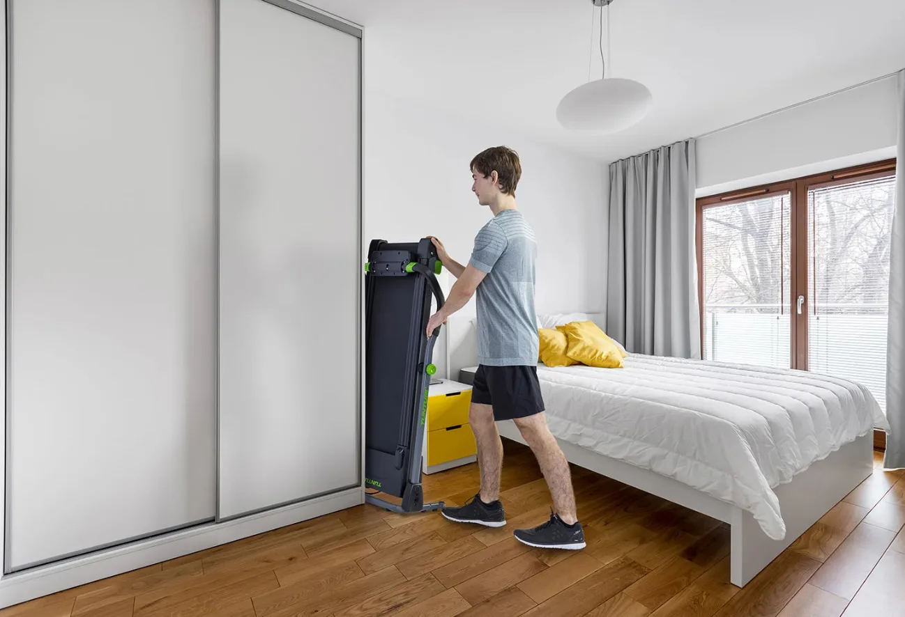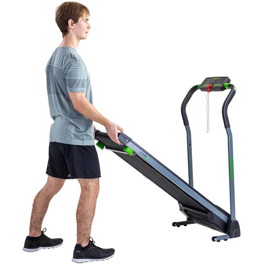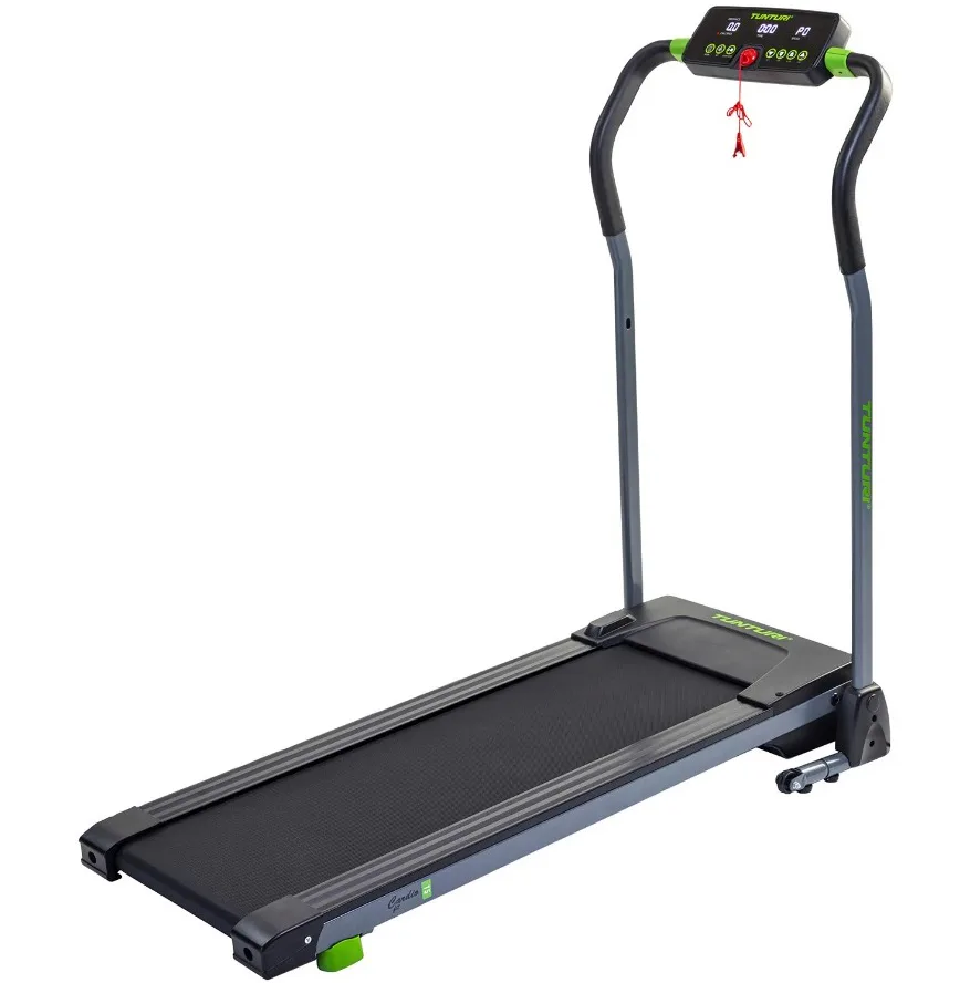 Tunturi Cardio Fit T5 je skvělý běžecký pás pro malé prostory. Skládání běžeckého pásu je snadné, takže jej můžete uložit za skříň. S Cardio Fit T5 můžete svůj pokoj proměnit na cvičební místnost okamžitě a bezpečně a pohodlně trénovat doma.