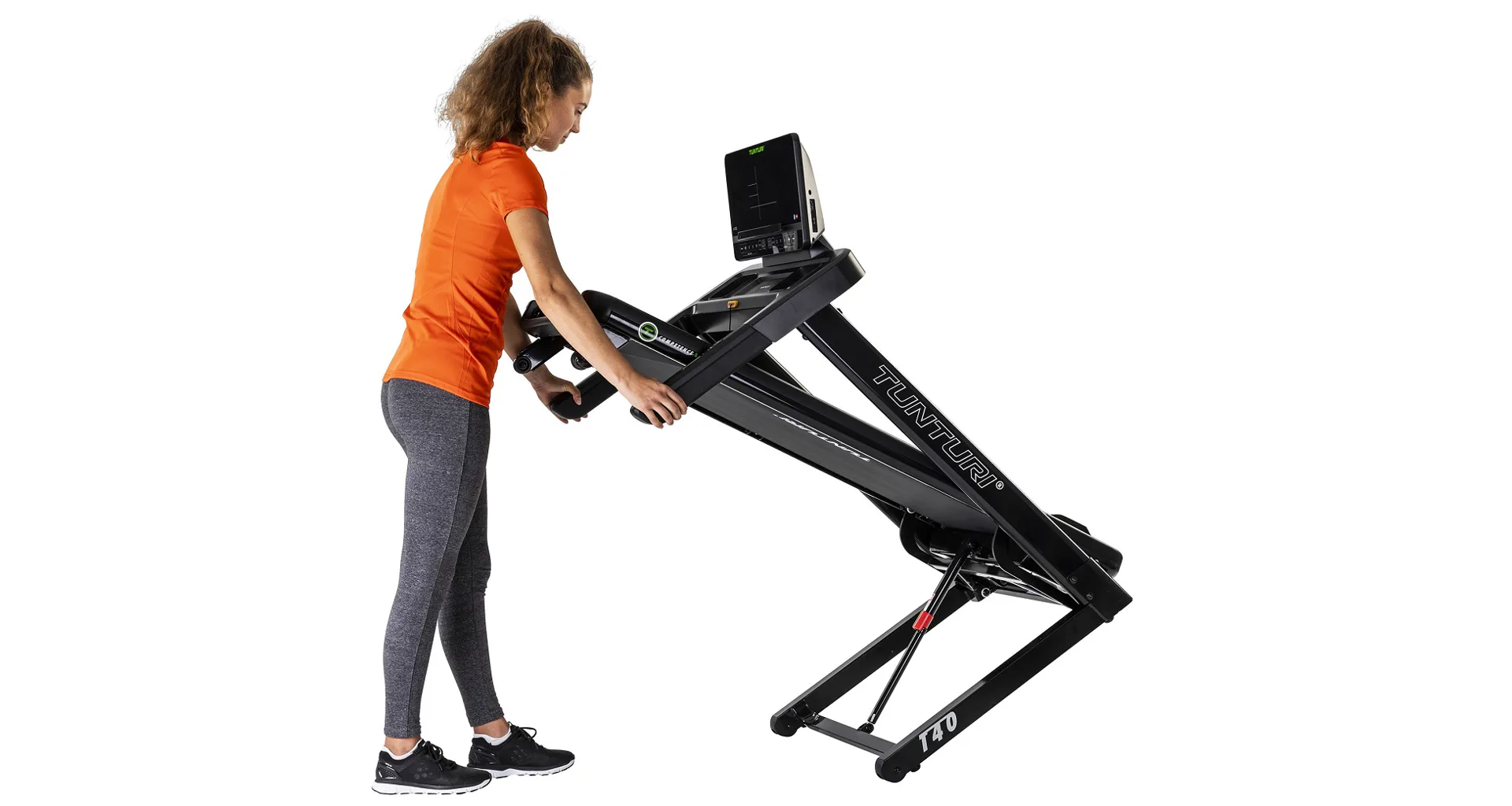 Součástí trenažéru TUNTURI T40 Competence je počítač s programy, Bluetooth zařízením, USB portem pro nabíjení a praktickým držákem na tablet/smartphone. Pro úsporu místa lze trenažér sklopit do vertikální polohy.