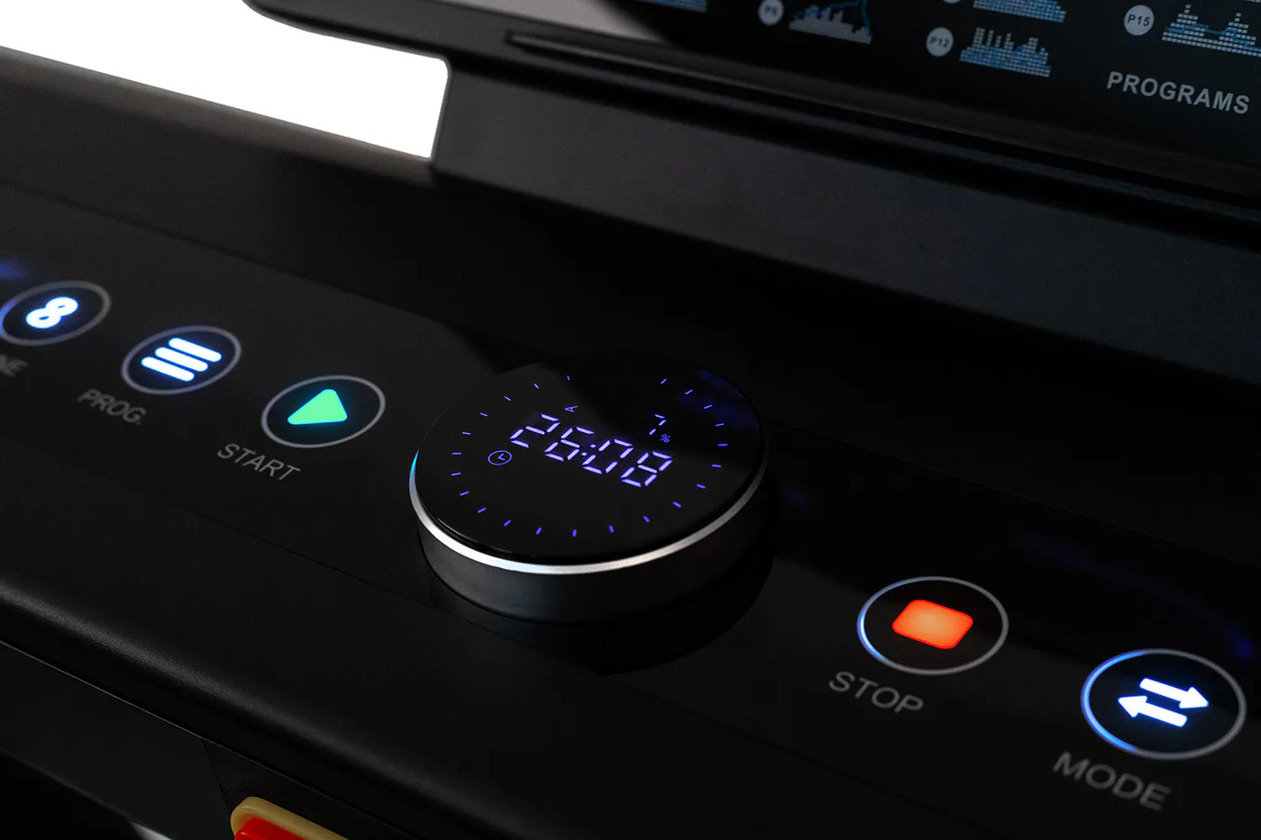Rychlost běhu a sklon si můžete nastavovat během tréninku ručně tlačítky, případně si můžete si vybrat některý z 15 přednastavených tréninkových programů. Pro maximální efektivitu tréninku můžete využít měření tepové frekvence skrz dlaňové snímače tepové frekvence.