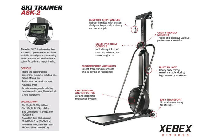 Můžete trénovat libovolně soupaž i střídavě používat ruce a dokonale pilovat techniku a vytrvalost. Tento trenažér ale není určen jen pro hobby či profi lyžaře, jedná se o skvělý způsob jak trénovat vaše tělo ať už pro budování kondice či spalování tuků.Navíc je trenažér prostorově velmi nenáročný a můžete jej využívat s maximální intenzitou. Trenažér XEBEX Ski Trainer 2.0 nabízí přehledný podsvícený LCD monitor na kterém můžete sledovat všechny měřené hodnoty.Magnetický odpor je elektronicky nastavitelný v několika stupních a můžete využívat řadu přednastavených režimů pro váš trénink.Masivní konstrukce rámu zajišťuje dlouhodobou životnost trenažéru a všechny kladky jsou osazeny profesionálními kuličkovými ložisky pro bezúdržbové a bezproblémového používání.
